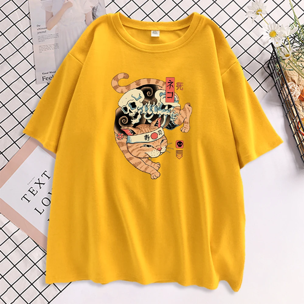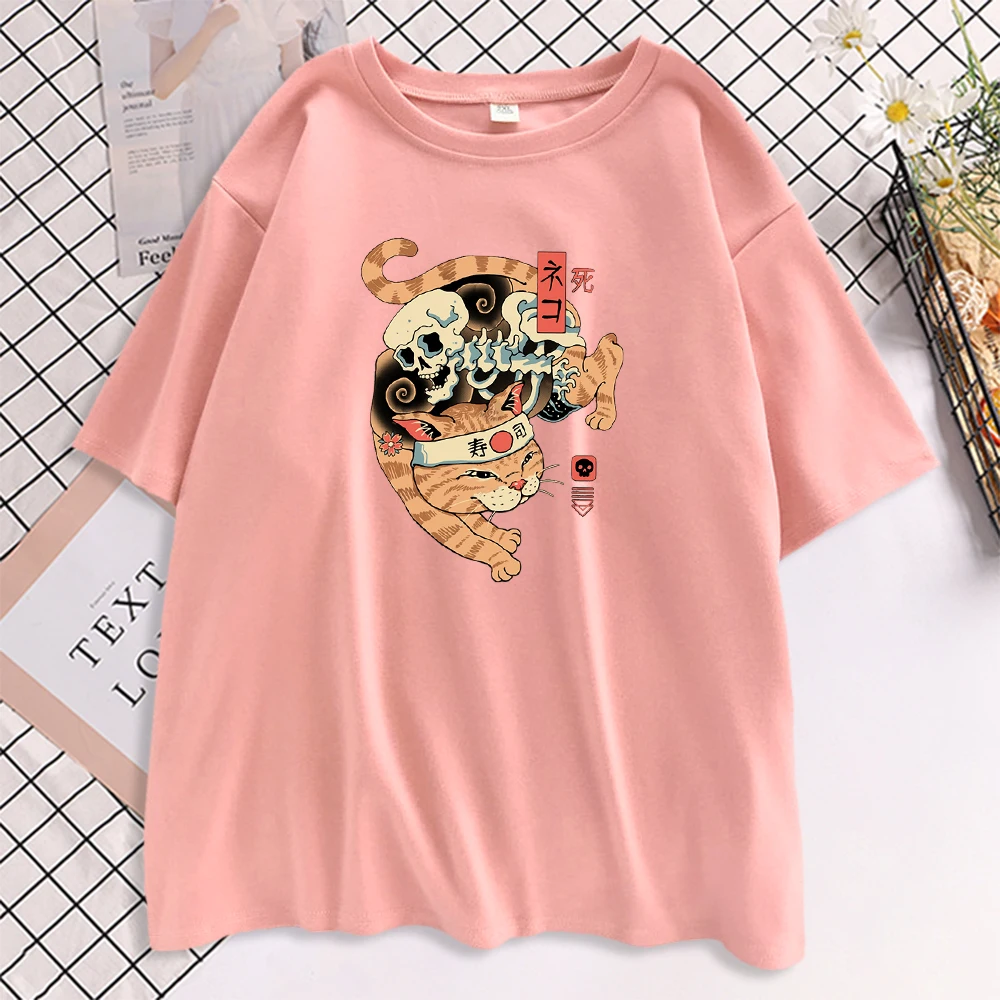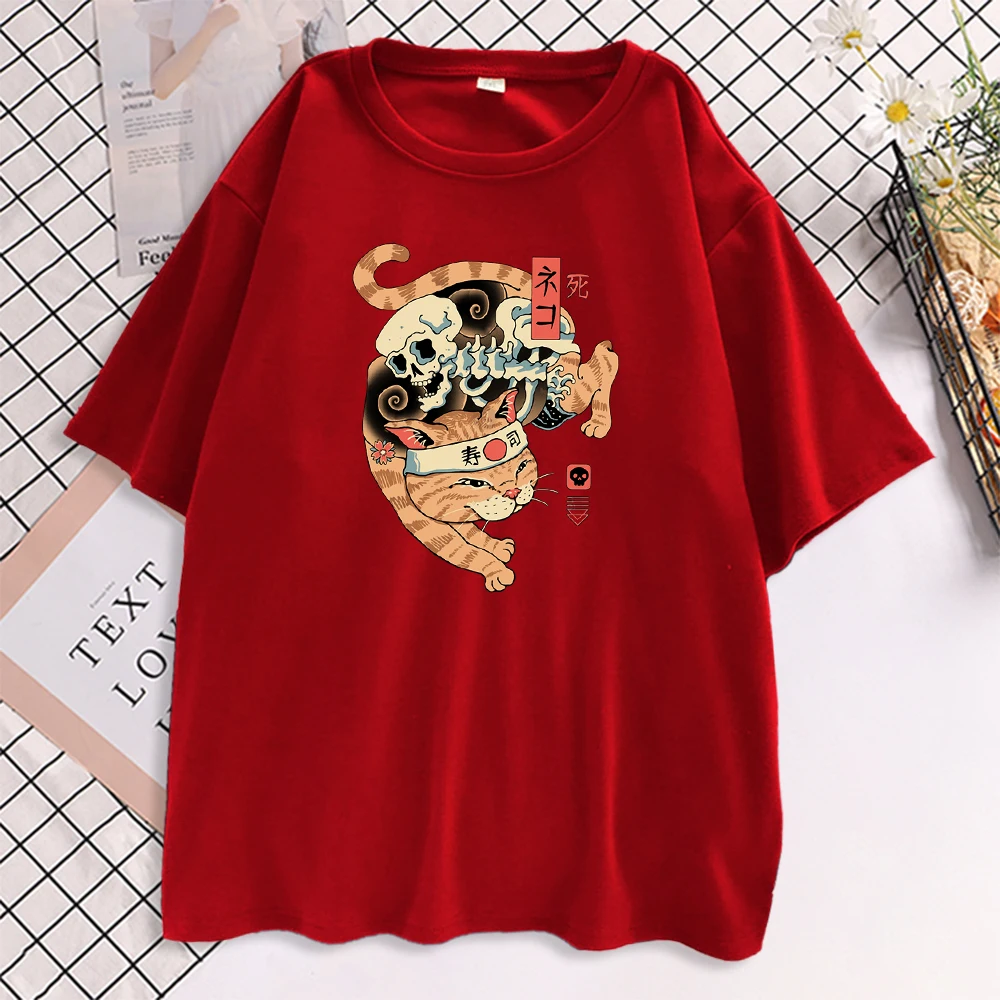 Футболка женская в японском стиле укиё-Э, с принтом кошки, свободная футболка с круглым вырезом, модная мягкая футболка, лето 2021