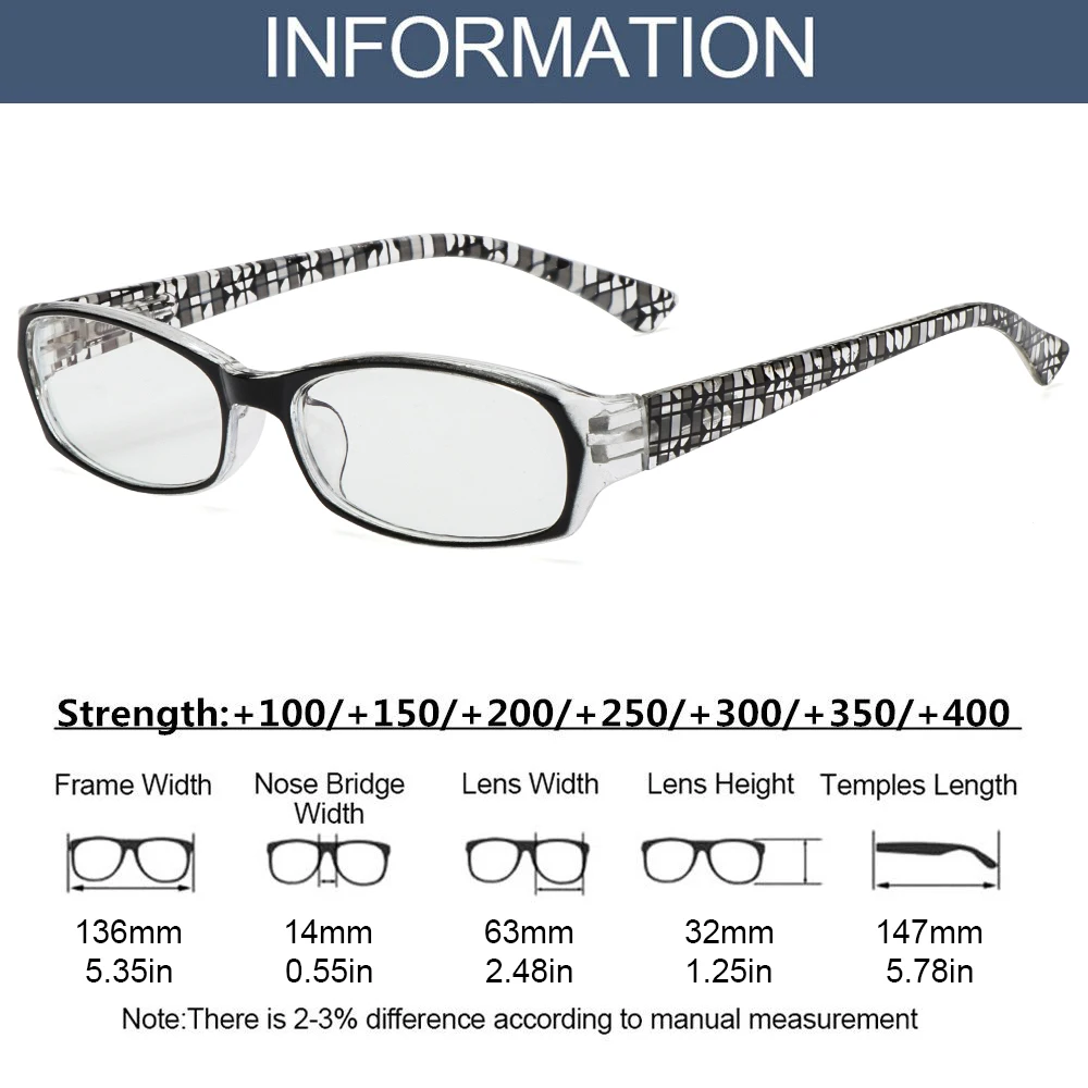 Тип: анти-синий светильник для чтенияМатериал: ПоликарбонатДлина оправы: 136 ммШирина линз: 63 ммВысота линз: 32 ммДлина ножек очков: 147 ммЦвет: черный, фиолетовый, красныйПрочность: + 100/+ 150/+ 200/+ 250/+ 300/+ 350/+ 400Стиль: анти-синий светильник, ультра-светильник h, модный, элегантный, с цветамиПол: женщинОсобенности:Высокое качество анти-синий светильник очки для чтения.Анти-синий светильник эффективно блокирует вредный синий светильник и защищает здоровье ваших глаз.Материал из поликарбоната, ультра-легкий, удобный в ношении.Можно носить с повседневными нарядами или для модных нарядов.Они подходят для женщин с дальнозоркостью зрения.