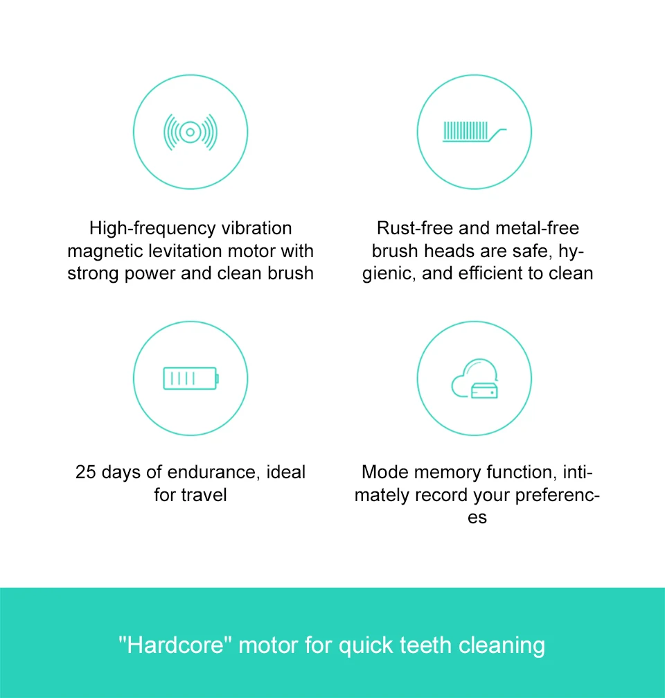 31000 раз в минуту высокочастотная вибрация, сильная чистка зубовБез ржавчины и без металла головка щетки, безопаснее и здоровее25 дней выносливости, хороший компаньон для путешествийФункция памяти Mode для записи ваших предпочтений и привычек