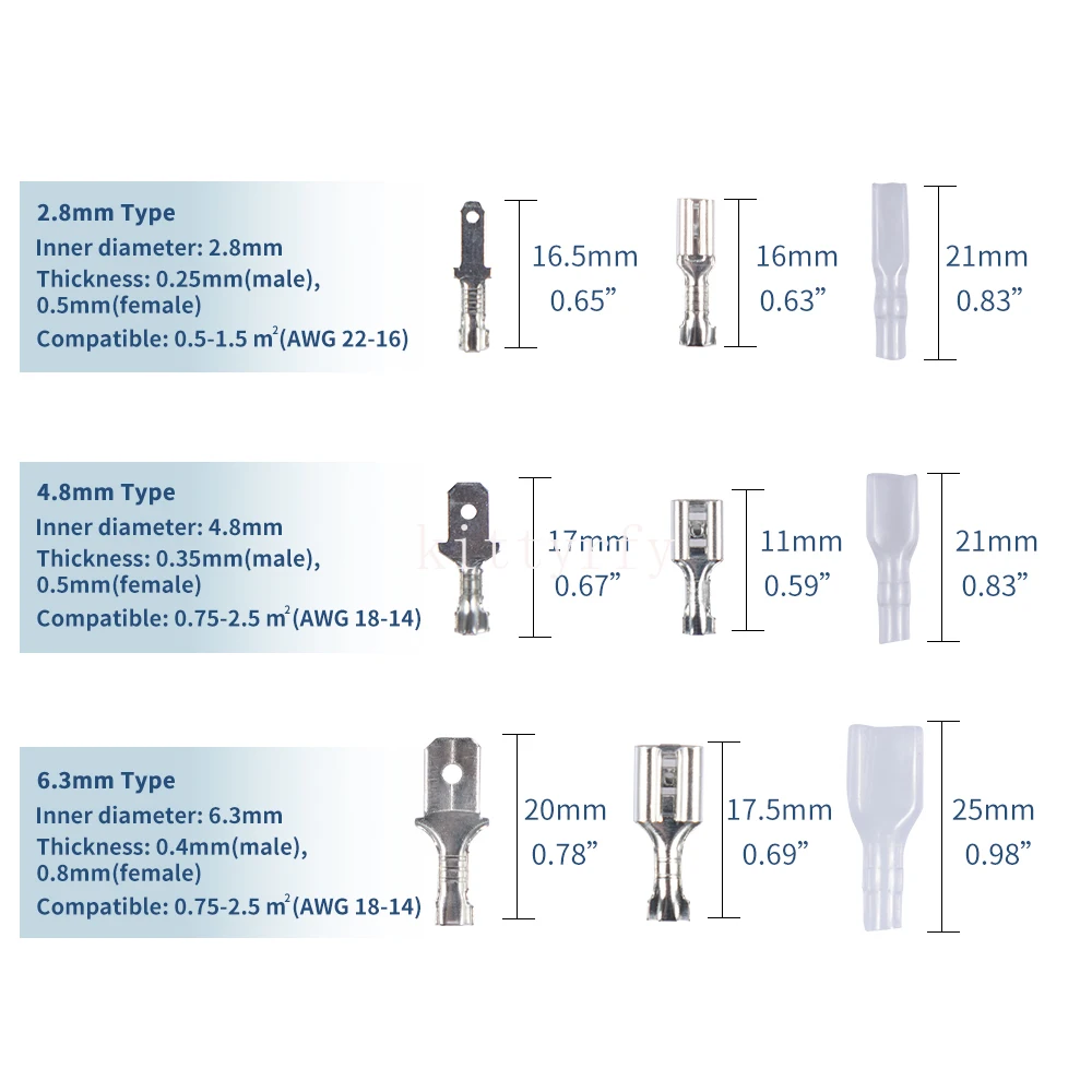 Примечание: Так как продукт является мультиатрибутным продуктом, пожалуйста, проверьте, соответствует ли количество продукта, которое вам нужно, заказу при оплате, спасибо. Спецификация:Фирменная новинкаМатериал: латуньОсновной цвет: золотой, серебряный, прозрачныйРазмер: прибл. 2,8/4,8/6,3 ммТолщина: прибл. 0,5 ммРазмер провода: 22 ~ 16AWG (0,5 мм2;-1,5 мм2;)Прочный и простой в установкеОчень удобный и практичный 270 шт.-30 шт 2,8 мм Женский терминал-30 шт. 4,8 мм на мини-разъем «мама»-30 шт 6,3 мм Женский терминал-30 шт 2,8 мм Мужской терминал-30 шт. 4,8 мм на мини-разъем «папа»-30 шт 6,3 мм Мужской терминал-30 шт оболочка 2,8 мм-30 шт. оболочка 4,8 мм-30 шт. оболочка 6,3 мм 210 шт.-25 шт 2,8 мм Женский терминал-25 шт. 4,8 мм на мини-разъем «мама»-25 шт 6,3 мм Женский терминал-25 шт 2,8 мм Мужской терминал-25 шт. 4,8 мм на мини-разъем «папа»-25 шт. 6,3 мм на мини-разъем «папа»-25 шт оболочка 2,8 мм-25 шт. оболочка 4,8 мм-25 шт. оболочка 6,3 мм 135 шт.-15 шт. 2,8 мм на мини-разъем «мама»-15 шт. 4,8 мм на мини-разъем «мама»-15 шт. 6,3 мм на мини-разъем «мама»-15 шт 2,8 мм Мужской терминал-15 шт. 4,8 мм на мини-разъем «папа»-15 шт. 6,3 мм на мини-разъем «папа»-15 шт оболочка 2,8 мм-15 шт. оболочка 4,8 мм-15 шт. оболочка 6,3 мм 120 шт без мужских клемм-20 шт. 2,8 мм на мини-разъем «мама» + 20 шт. изоляционная обшивка накидного-20 шт. 4,8 мм на мини-разъем «мама» + 20 шт. изоляционная обшивка накидного-20 шт. 6,3 мм на мини-разъем «мама» + 20 шт. изоляционная обшивка накидного Характеристика:Терминал свернут и шов свернут.Этот шов не может открываться при нормальных условиях напряжения или затягивания проволоки.Разработан с полным портом баррель, идеально подходит для трудно обжимать твердые провода или многожильные провода.Прочный и простой в установке.Подходит для подключения кабеля питания к электрическому оборудованию.Широко используется в машиностроении, электроэнергетике, железной дороге, судостроении, авиации, бытовой технике, автомобилях/лодочных динамиках и т. д. Примечание:Возможны незначительные погрешности в размере из-за ручного измерения.Цвет товара на фотографиях может слегка отличаться на разных мониторах компьютера так как мониторы откалиброваны по-разному.