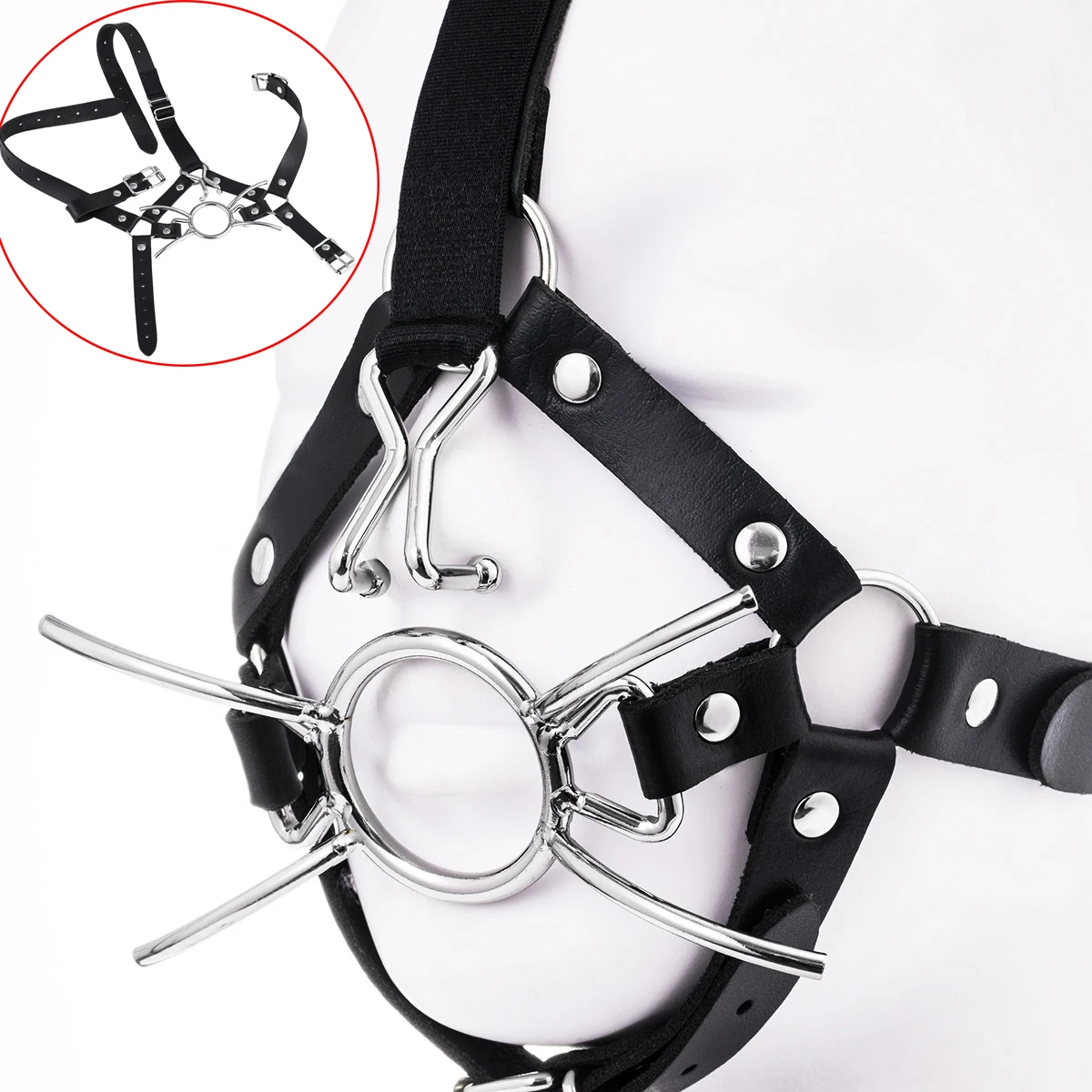 Новое металлическое уплотнительное кольцо Gag Spider, открытый рот, заглушка и крючок для носа, жгут из ПУ кожи, SM Slave бондаж для оральной фиксации, интимные игрушки для женщин