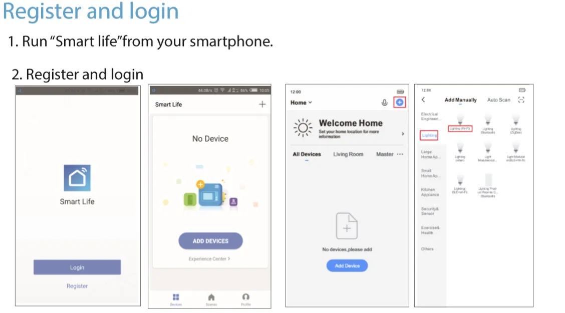 1. Подключите этот Wi-Fi полосы светильник контроллер к светодиодный светильник полосы через 4-контактный разъем, а также Подключите к источнику питания через порт постоянного тока с адаптером питания из светильник полосы. 2. Найдите «Smart Life» в вашем app store или отсканируйте qr-код в руководстве пользователя, чтобы загрузить и установить его. 3. Зарегистрируйте свою учетную запись Smart Life. 4. Перейдите в приложение «smart life» на вашем телефоне, нажмите на кнопку «Прямое подключение устройства контроля ", затем вы можете контролировать ваш светодиодный светильник полосы с помощью вашего телефона.