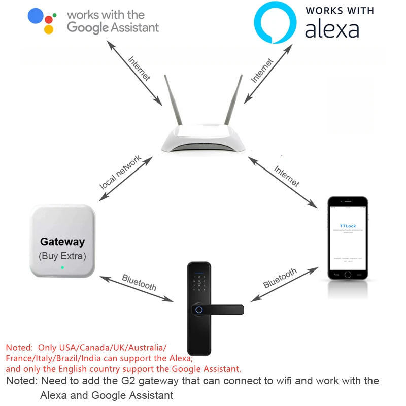 Блокировка подключается к телефону по Bluetooth.Вы можете открыть блокировку/управлять блокировкой (Добавить пользователя/удалить пользователя/установить пароль и так далее)Если добавить шлюз, который может подключиться к Wifi (шлюз купить дополнительно)Это полезно для управления отелямиДля iOS и Android телефоновЕсли добавить шлюз G2, можно подключиться к wifi и работать с Alexa и Google Assistant