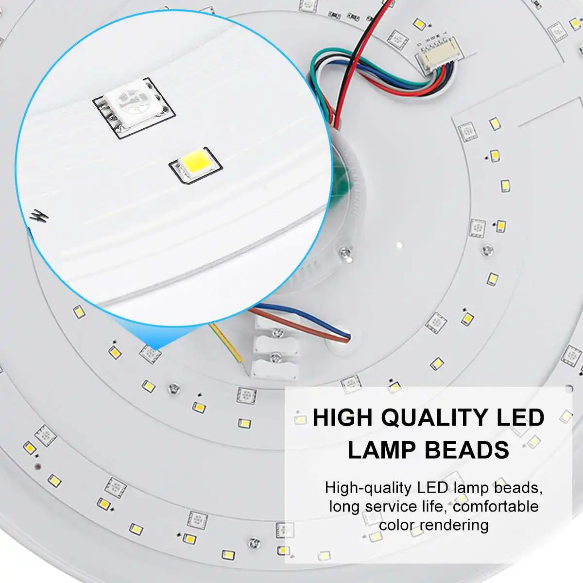 Посылка включает в себя:1x умный светодиодный потолочный светильник1x набор монтажных аксессуаров1x пульт дистанционного управленияПараметрыНапряжение: 110-245 В/50-60 ГцМощность: 300 ВтДиаметр: 34 смРежим управления: настенный выключатель + управление мобильным приложением + пульт дистанционного управления + интеллектуальное аудио управлениеСветильник режимы: подстраиваются под тусклый или яркий, ритм музыки прозрачный градиентный фон красочный flashinging светильникВерсия Wi-Fi: Поддержка amazon, google, Tmall Genie, Xiaodu и другого интеллектуального Аудио управления, мобильный пульт дистанционного управленияОсобенности:* Изготовлено из Высококачественная светодиодная микросхема, толстый акрил, который обеспечивает долгий срок службы, долговечный для использования.* Умное управление: светильник может управляться различными способами, такими как настенный выключатель, мобильное приложение и пульт дистанционного управления, что обеспечивает более удобство управления.* Мульти-Режим работы: он имеет много режимов, белый светильник, теплый светильник, нейтральный светильник, прочный светильник, режимы сцены, такие как музыкальный ритм, градиент, красочный светильник с подсветкой, чтобы удовлетворить ваши различные потребности гибко, очень практично для вашей повседневной жизни.* Мобильное приложение и bluetooth могут регулировать яркость, менять цвет, пульт дистанционного управления может включать и выключать светильник, регулировать яркость и цвет, воспроизводить песни, регулировать громкость, это такой умный потолочный светильник, который изменит вашу концепцию на потолочный светильник, Это как верный компаньон, который позаботится о вашем настроении.* Энергосбережение: с ярким источником высокой мощности Светодиодный светильник, экономия большой мощности по сравнению с тем же уровнем яркости нормальный светильник, который не применяется светодиодный чип, экологически чистый.* Умное управление: это приложение доступно для устройств Apple Iphone, Ipad и Android.