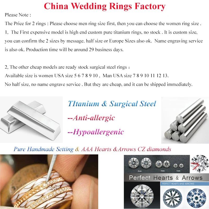 Обратите внимание: Цена за 2 кольца: сначала выберите мужской размер кольца, затем вы можете выбрать размер кольца для женщин. 1. Первая дорогостоящая Модель-это высококачественные изготовленные на заказ кольца из чистого титана, нет в наличии. Это Индивидуальный размер, вы можете подтвердить 2 размера в сообщении. Половина размера или Европейский Размер s также в порядке. Услуга гравировки имени также в порядке. Время производства составит около 29 рабочих дней. 2, другой дешевой модели в наличии хирургическая сталь кольца из нержавеющей стали, в наличии размеры для женщин размер США с увеличенной полнотой, 5, 6, 7, 8, 9, 10, человек размер США с увеличенной полнотой 7, 8, 9, 10, 11, 12, 13 лет. Нет половины размера, нет заготовка для подвески с гравировкой имени службы. Но они дешевые, и они могут быть отправлены немедленно. Флуоресцентный