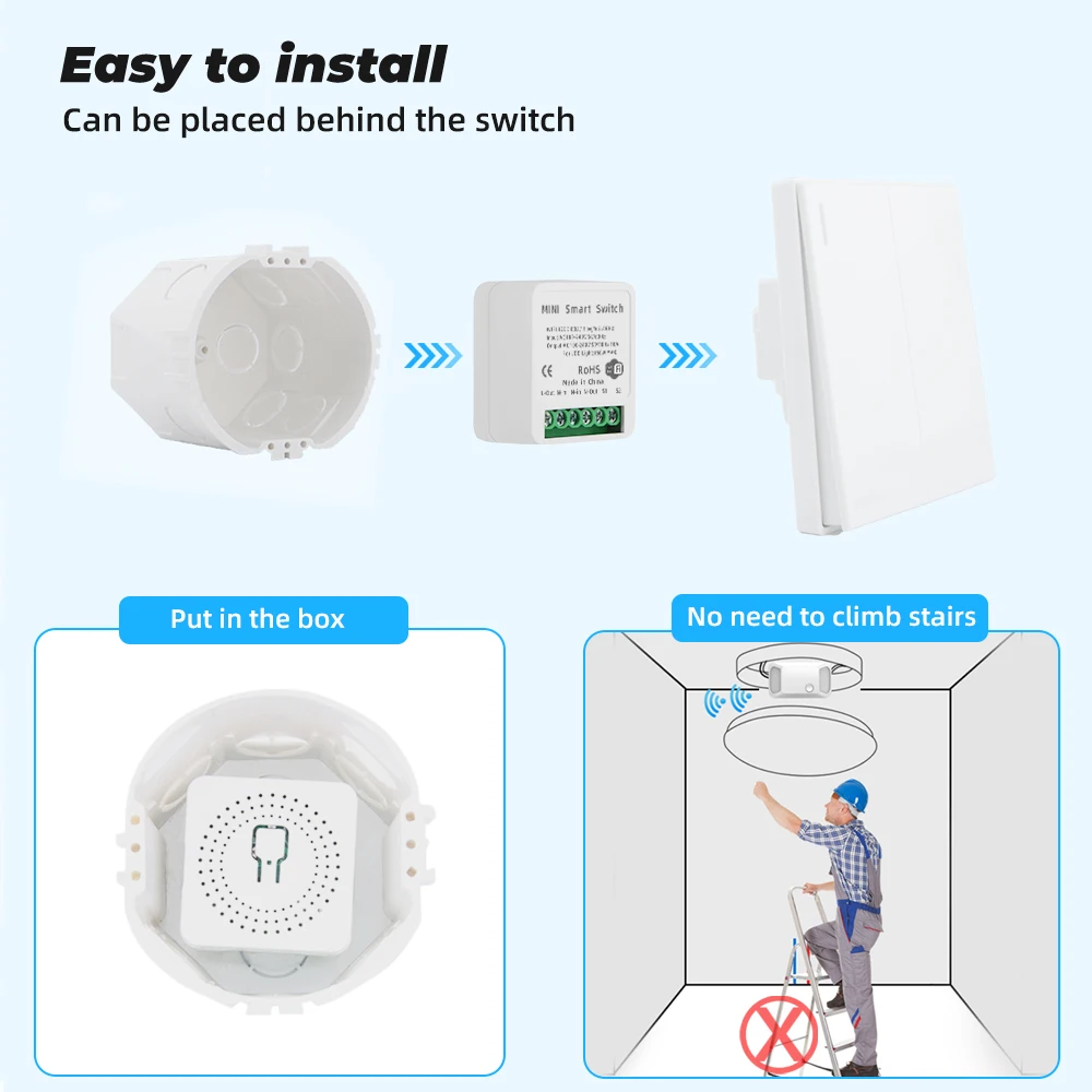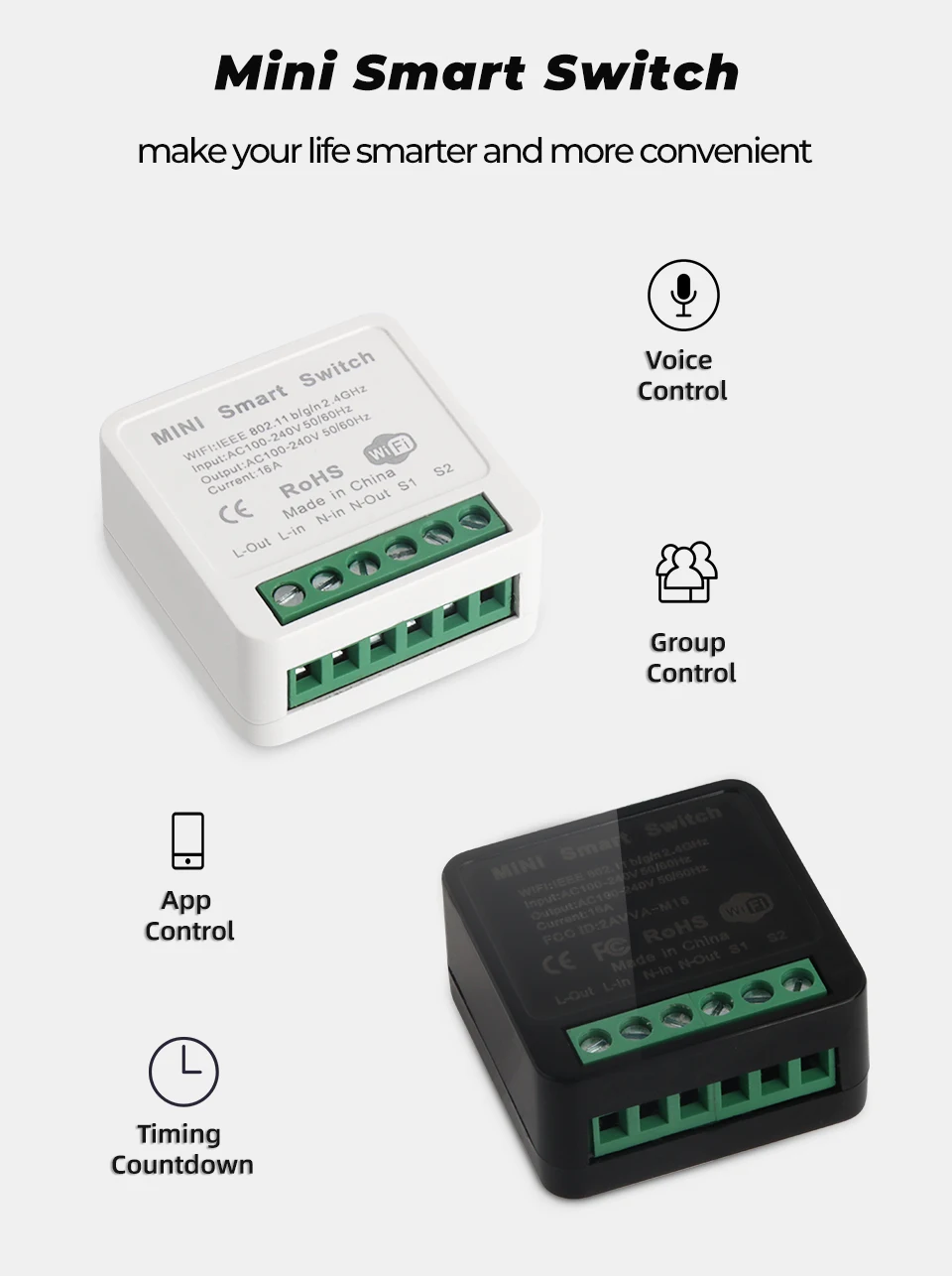 Разработан Мини-корпус 42*42*20 мм, который работает с большинством ящиков, выключателей и настенных розеток. Он не только маленький, но и мощный. Максимальная мощность достигает 1800-3450 Вт, он используется для большинства бытовых приборов и светильников. Поддержка двустороннего управления этот умный переключатель DIY может использоваться для вашего старого переключателя управления 2 способами. Особенно, вы по-прежнему можете управлять старым переключателем вручную после того, как он был запущен. Пульт дистанционного управления с помощью приложения освещение или приборы вашего дома через приложение Smart Life из любого места в любое время. Концентратор не требуется. Голосовое управление wifi DIY switch работает с Alexa и Google Home Assistant, чтобы удобно управлять устройствами с помощью простой голосовой команды, когда вы находитесь в пути. Функция синхронизации создает графики для автоматического включения/выключения бытовых приборов или освещения. Помогает вам экономить энергию и Электрический сбор. Настройка состояния реле никогда не беспокойтесь о сбое питания, вы можете установить этот переключатель, чтобы восстановить состояние после включения питания. Групповое управление Установите все ваши умные переключатели в группе через приложение smart Life. Затем одним нажатием, чтобы выключить все ваши приборы или светильники смартфоном.