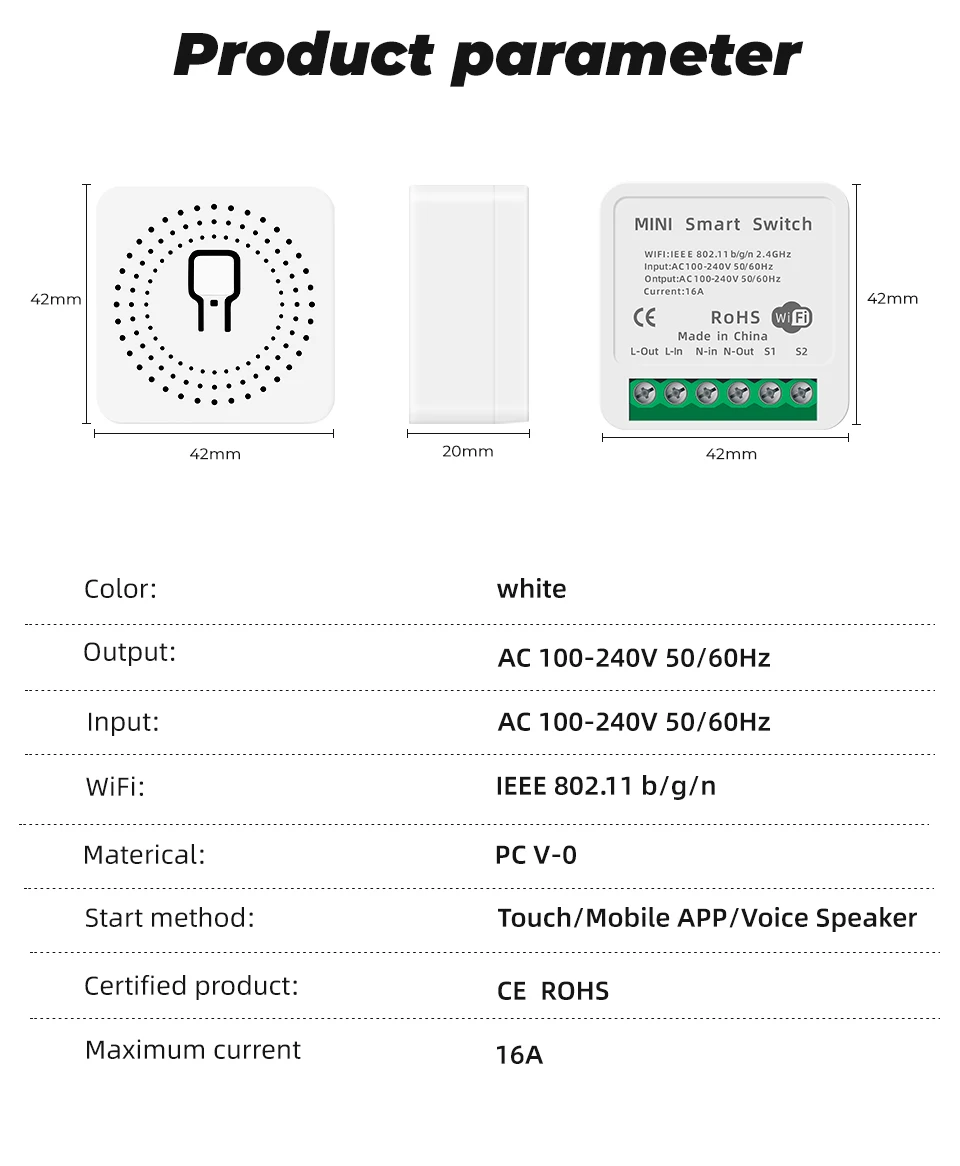 Вход Напряжение: 100-240V 50/60Hz Макс. Ток холостого хода: 16A Wi-Fi Стандартный: 2,4 ГГц 802,11 b/g/n название приложения: Tuya Smart/Smart Life Размеры: 42*42*20 мм