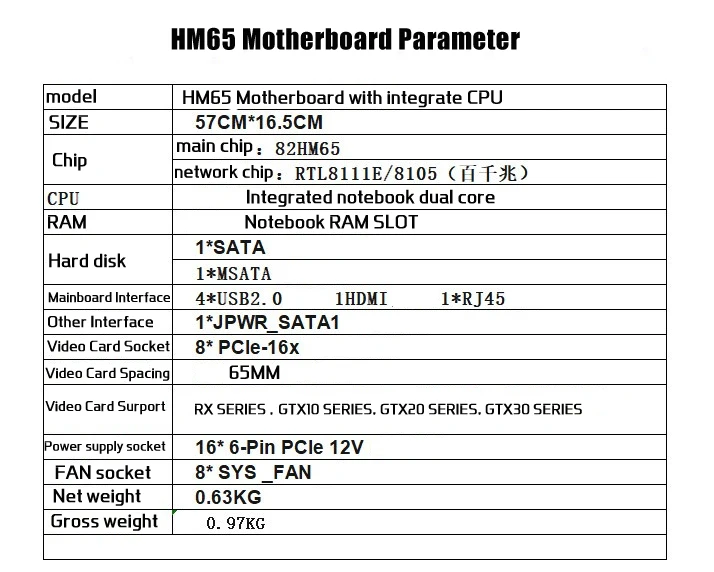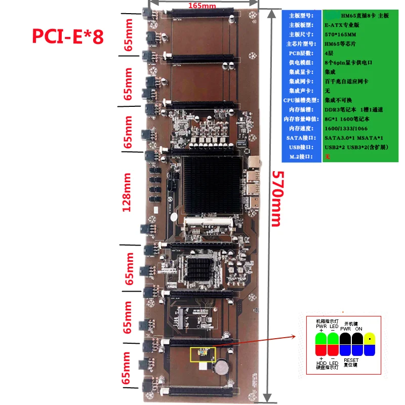 Материнская плата для майнинга 8 GPU, материнская плата для майнинга криптовалюты, эфириума биткоина, без резерва HM65, поддержка 106613331600 МГц