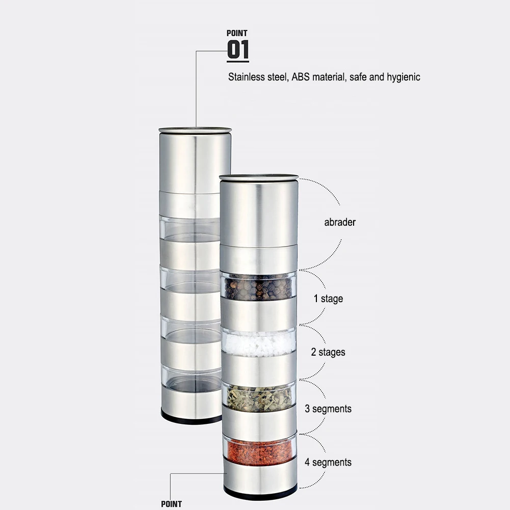 Характеристика:Подключаемый дизайн, экономит место.Многофункциональная банка для специй с мясорубкой, экономит время приготовления.Позиции 4 банок для специй могут быть изменены.Спецификация:Материал корпуса: нержавеющая сталь и АБС-пластикЦвет продукта: серебристыйРазмер продукта: 21,5*5*5 смВес нетто продукта: 270 гПримечание:В связи с различиями мониторов и эффектами освещения реальный цвет товара может немного отличаться от цвета на фотографиях. Спасибо!Возможны отклонения в 1-2 см вследствие измерений вручную.