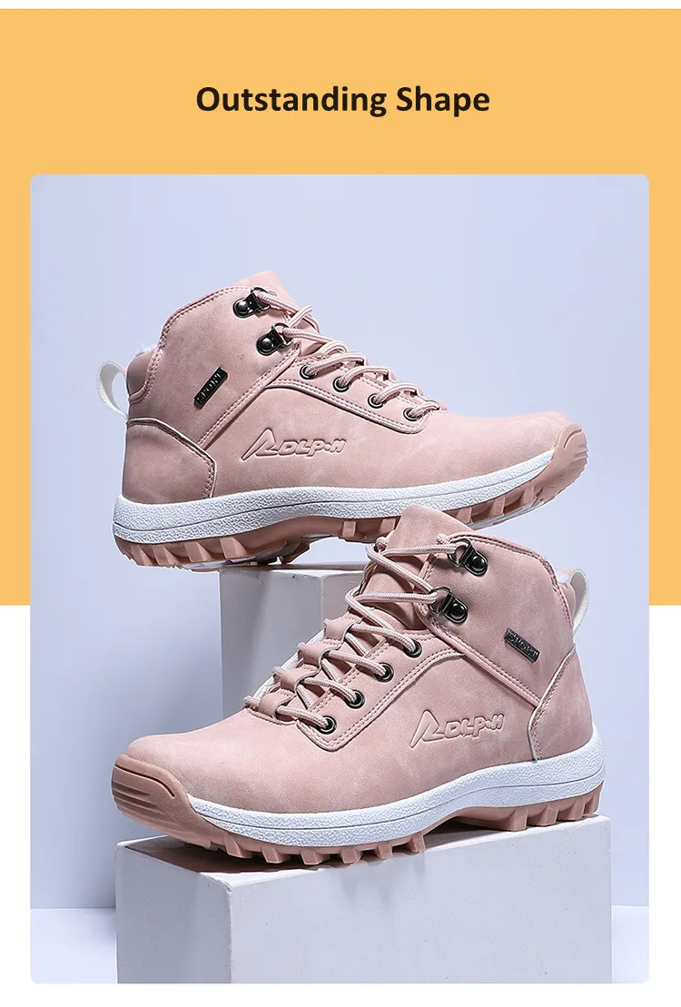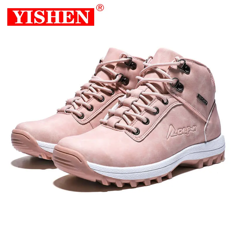 Женские зимние кроссовки YISHEN, розовые водонепроницаемые кроссовки из натуральной кожи и плюша, на платформе, на шнуровке, модные повседневные ботинки