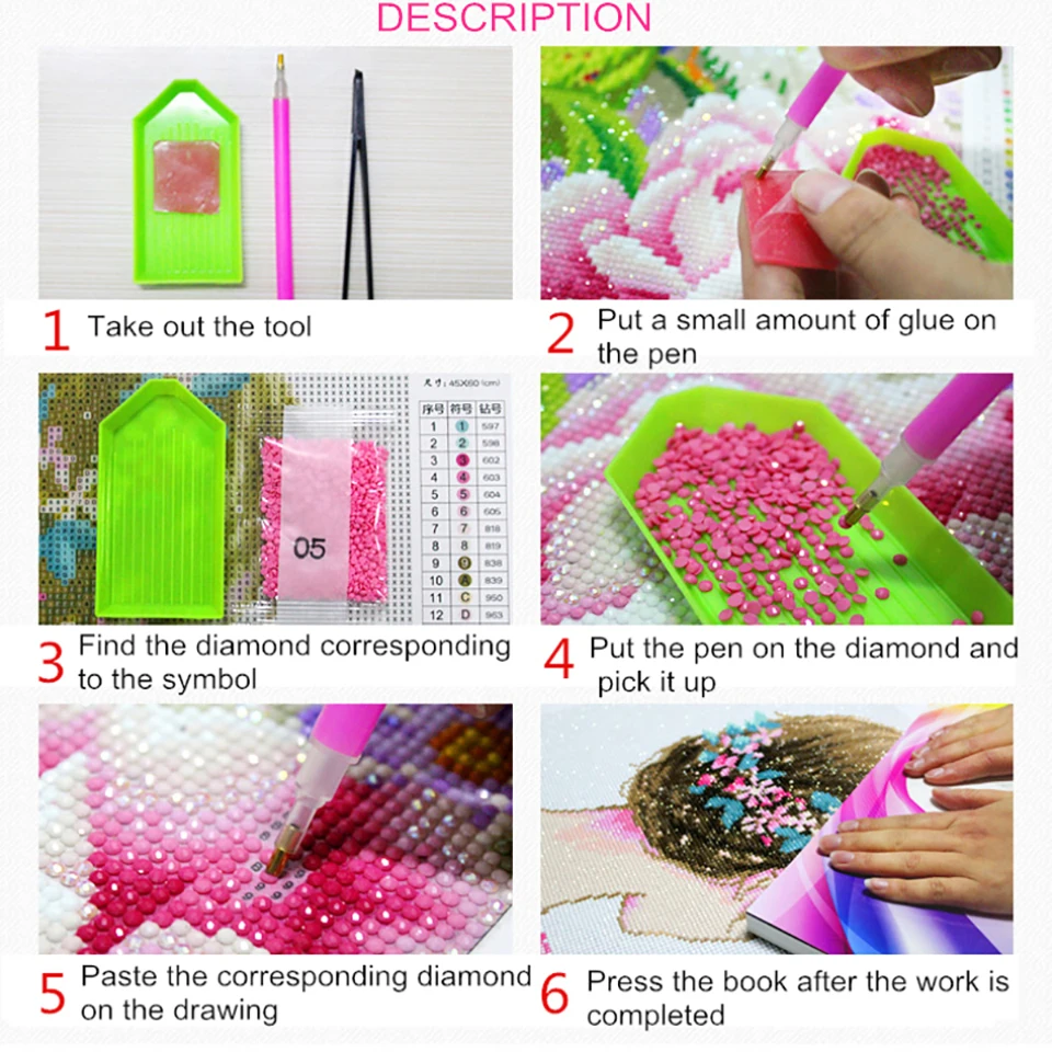 1. Раскройте небольшую часть двусторонней ленты2. Точечное сверло, обернутое клеем3. Найти соответствующий алмаз по symbol у4. Налейте бриллиант в пластину и используйте ручку для поглощения5. Найдите соответствующий символ точечного сверла6. Используйте книжку для нажатия после вставки