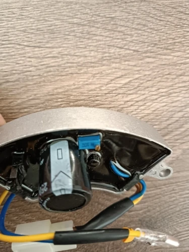 Працює!Не гріється. Провіряв на однофазному генераторі і на трьохфазному,до 2,5кВт.Прийшлося тільки трохи підкоректувати напругу синім резистором,який стирчить з АВРа.
