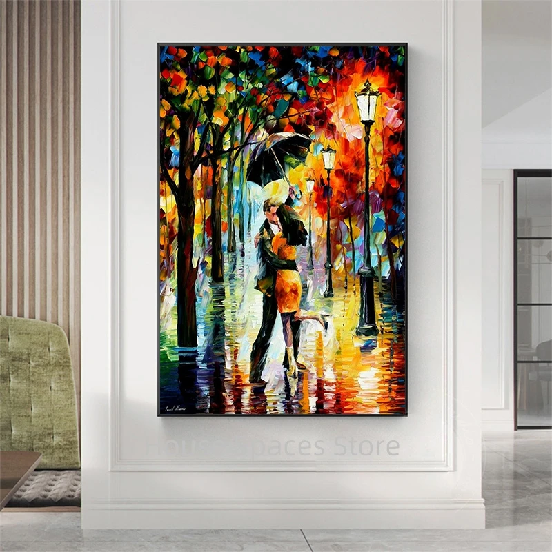 Абстрактная парная Поцелуи с зонтом под дождем, Классическая Картина на холсте, печатный плакат, настенные художественные картины для дома, гостиной