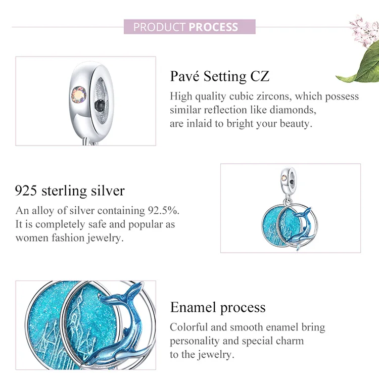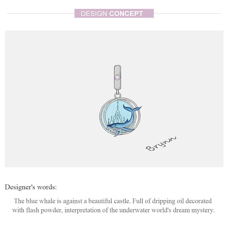 Размеры: 2,3*1,2 см Материал: S925 + Pavé установка CZ + эмаль процесс + покрытая платиной Вес: 2 г Описание: синий кит против красивого замка. Полное капающего масла, украшенное порошком вспышки, интерпретация тайны мечты подводного мира.