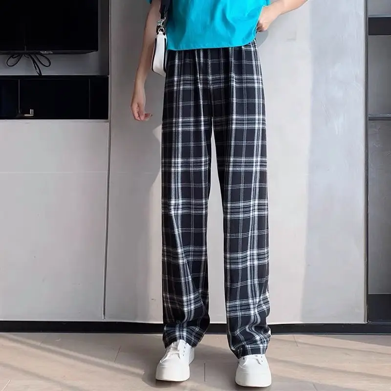 Свободные прямые брюки, женские брюки, Летние Новые Шахматные брюки с поясом, Свободные корейские брюки в клетку, широкие брюки