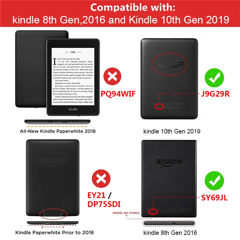 1. Все новое поколение Kindle 10th, выпущенное в 2019 и kindle 8th Generation 20162. Код машины: J9G29R / SY69JL3. Этот чехол Kindle подходит только для базового поколения Kindle 10th, выпущенного в 2019 году (модель No. J9G29R), не подойдет для Kindle Oasis 10 Gen 2019 (номер модели. S8IN4O) или Kindle Paperwhite 10th Gen 2018 (номер модели. PQ94WIF).Не подходит:Kindle Paperwhite 10 поколение выпущено в 2018 году,Kindle Paperwhite (2012, 2013, 2014, 2015 совершенно новой версии 300 PPI и 2016 белая версия), элктронных книг Kindle, 6 "БЛИКОВ сенсорного экрана Дисплей (7th Gen, 2014 выпущен),Предыдущий Kindle (Kindle 4/5) с кнопкой,Kindle Voyage / Kindle Keyboard / Kindle OasisЛюбые другие устройства, не покрытые выше