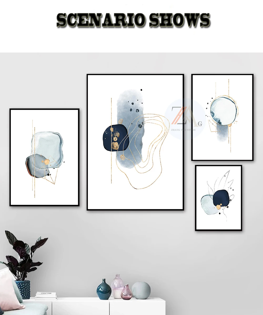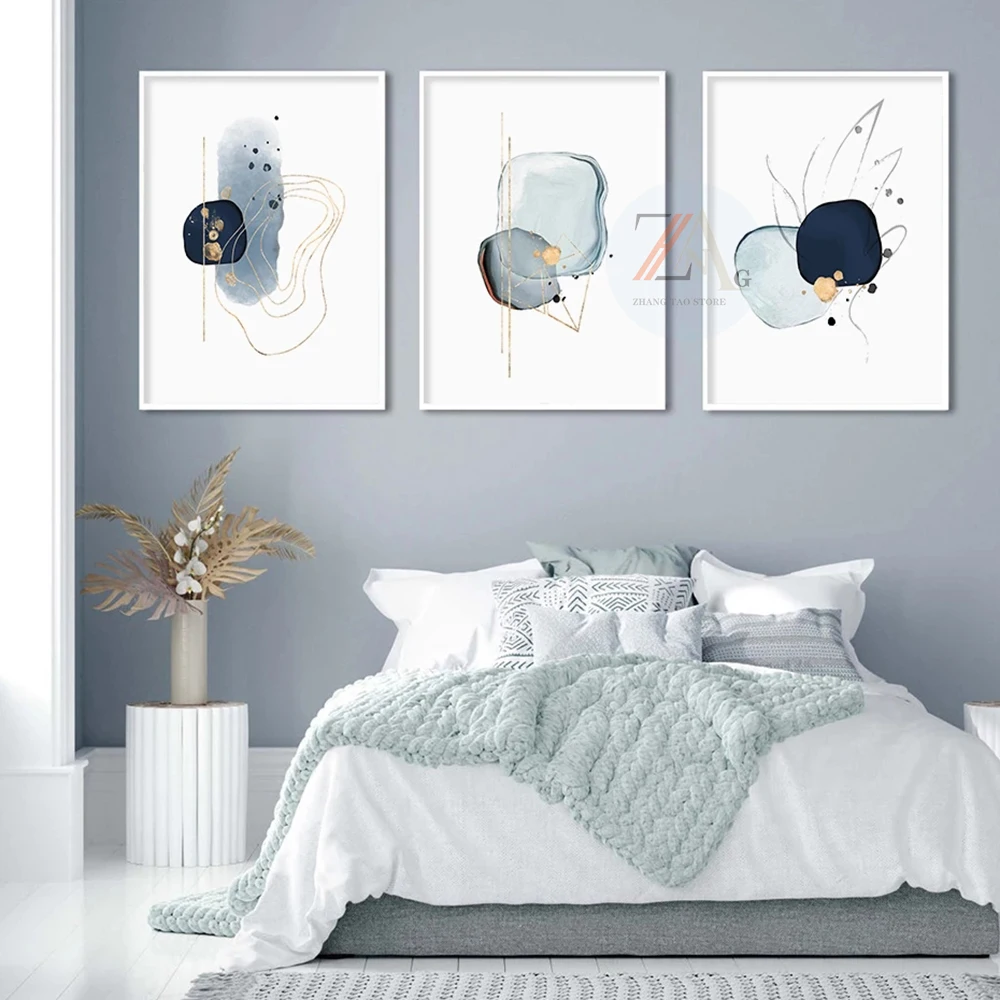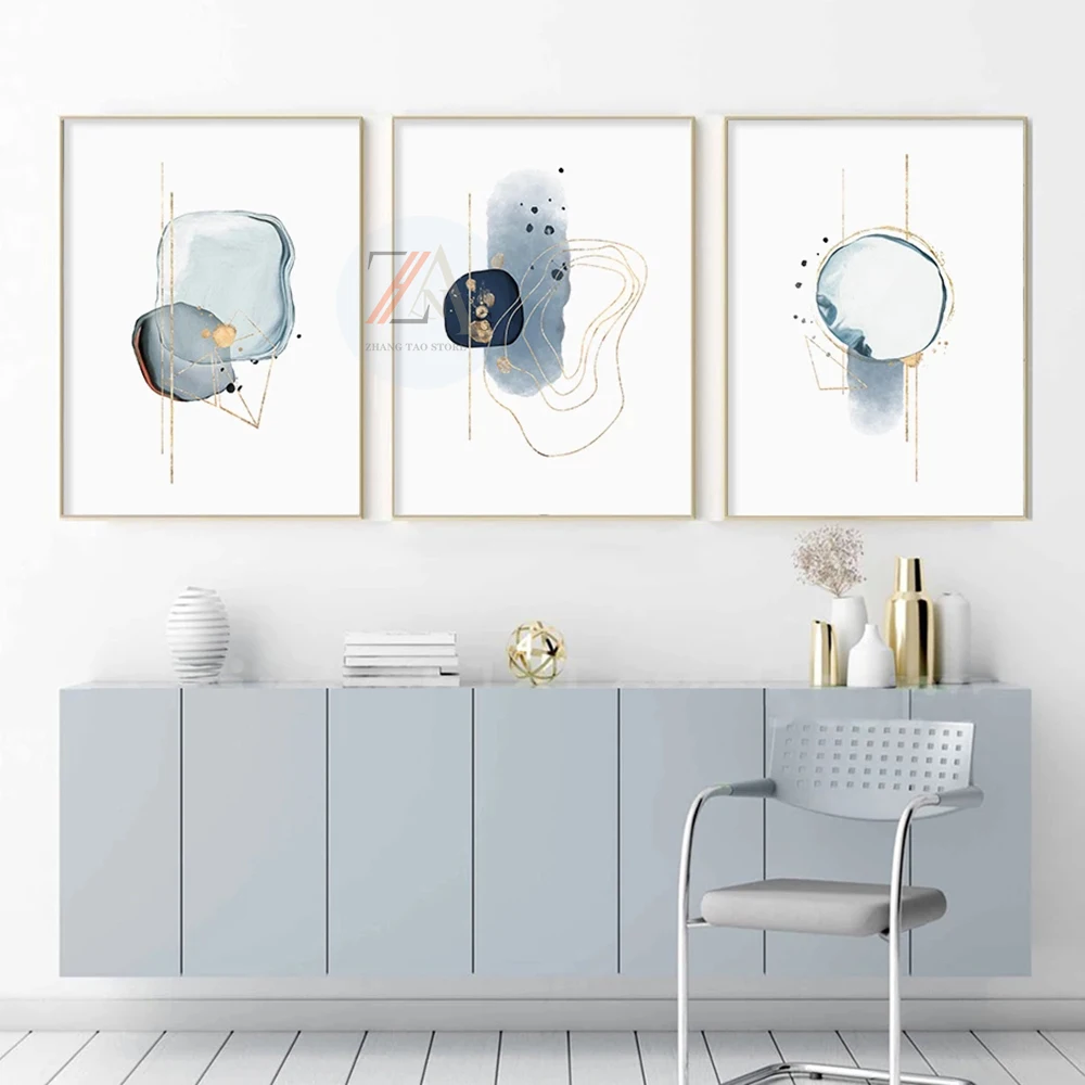 Современная абстракция синяя эскиз, простая Золотая линия, картина, искусство на стену, украшение для дома и декор комнаты