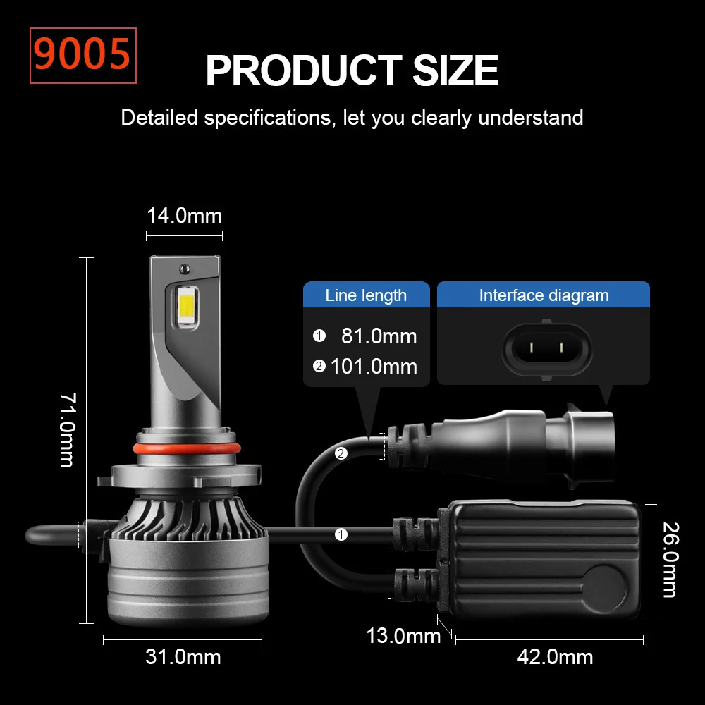 Идеальный мощный с импортом 3570 чипов CSP, 360 градусов чистый луч без слепой зоныСпециальный дизайн и небольшой размер корпуса, легко установить; Plug & PlayВысокая Скорость Вентилятор охлаждения гарантирует, что ваш светодиодный головной светильник лампы более 50000 часов яркого непрерывного светильник.IP67 водонепроницаемый, пылезащитный.Гарантия 1 год• Мощность: 100 Вт/комплект• Световой поток: 30000LM• Цветовая температура: 6000K/8000K• Светодиодный чип: импортные чипы 3570 CSP• Угол луча: 360 градусов• Класс водонепроницаемости: IP67• Материал: авиационный алюминиевый 6063• Рабочая температура: -40C ~ + 120C• Срок службы: >50 000 часовПосылка включает в себя:2x светодиодный лампы для фарТип вилки:H4-Дальний светH7/H11/9005/9006/9012 Одиночный луч