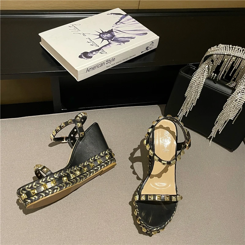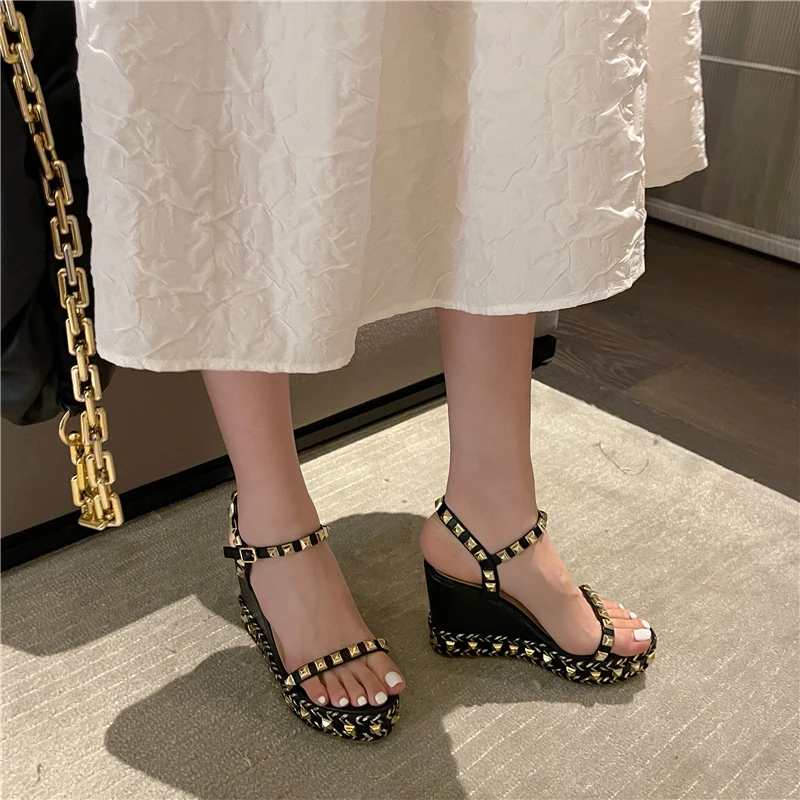 Сандалии на танкетке для женщин, удобные роскошные дизайнерские привлекательные летние модные Нескользящие шлепанцы на высоком каблуке с заклепками и пряжкой, 2021