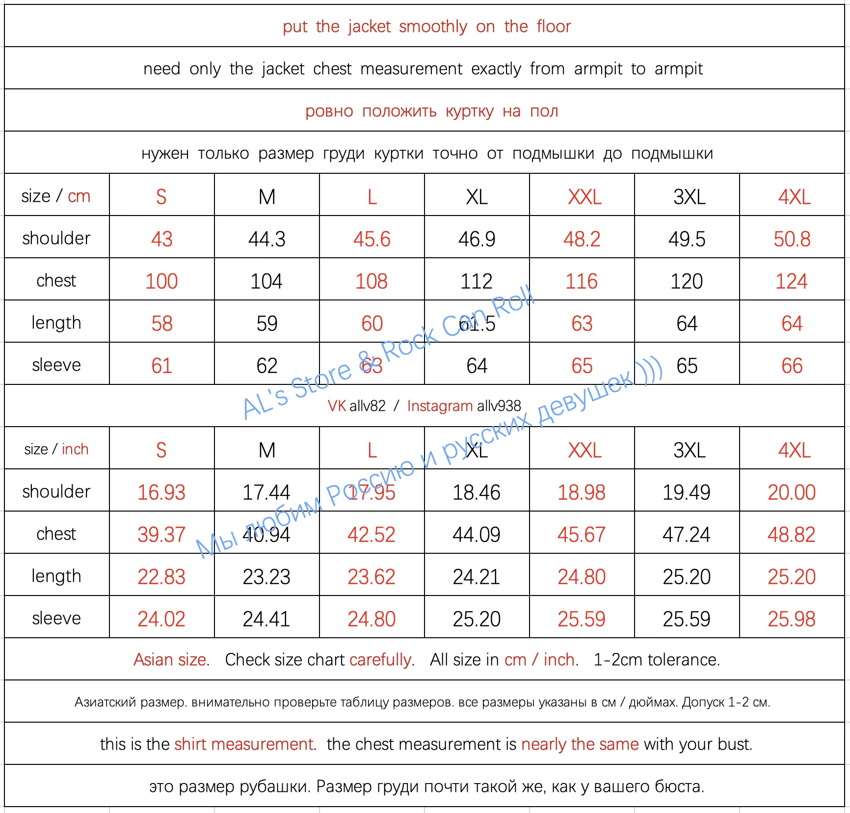 Пожалуйста, проверьте таблицу размеров и измерьте вашу куртку, как показано ниже.