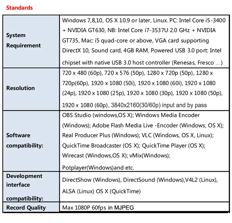USB3.0 выходной формат: макс. 1920x1080 60 fps в MJPEG, не поддерживает YUY2