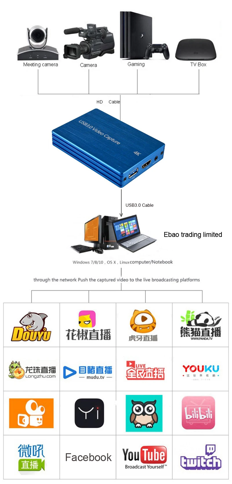 1. Введение продукта: С помощью этой карты видеозахвата HD USB 3,0 вы можете записывать или передавать свои HD игры или другие HD видео Источник с 3-м вечерние программного обеспечения, совместимый с Windows, Linux, Mac OS X USB 3,0 интерфейс, он отвечает UVC и Стандарт UAC, без необходимости установки драйверов, реальный PnP, прост в использовании. Входное разрешение до 4K/30 Гц, Разрешение захвата до 1080P/60 Гц в MJPEG, не поддерживает YUY2 Основная функция: Запись видео + Прямая трансляция ПК Состояние: абсолютно новое и высокое качество, покупайте с уверенностью! HD ВХОД: Подключите выходные устройства, совместимые с HDMI, такие как HD видеокамера, игровой плеер, dvd-плеер, TV box, для PS3/4/5/XBOX/Switch Player, для iPhone и т. д. (не рекомендуется использовать для телефона android) USB3.0 выход: Этот слот подключается к порту USB 3,0/2,0 компьютера или ноутбука. Выход Аудио: подключите наушники к монитору источника видео Микрофон: Подключите вход микрофона для захвата собственного звука Выход HD: Подключите HDMI-совместимый телевизор или монитор к локальному источнику видео. Светодиодный: мощный красный светильник. 5 в пост. Тока: подключите блок питания 5 в постоянного тока