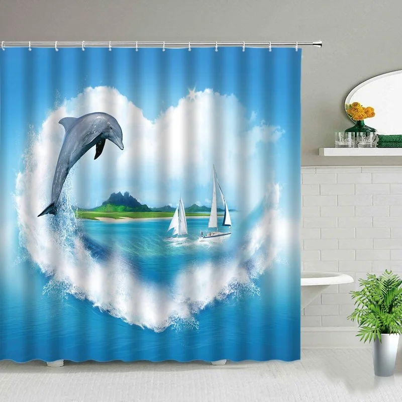 Занавеска для душа с изображением дельфина в океане, пляжа, пальмы,...