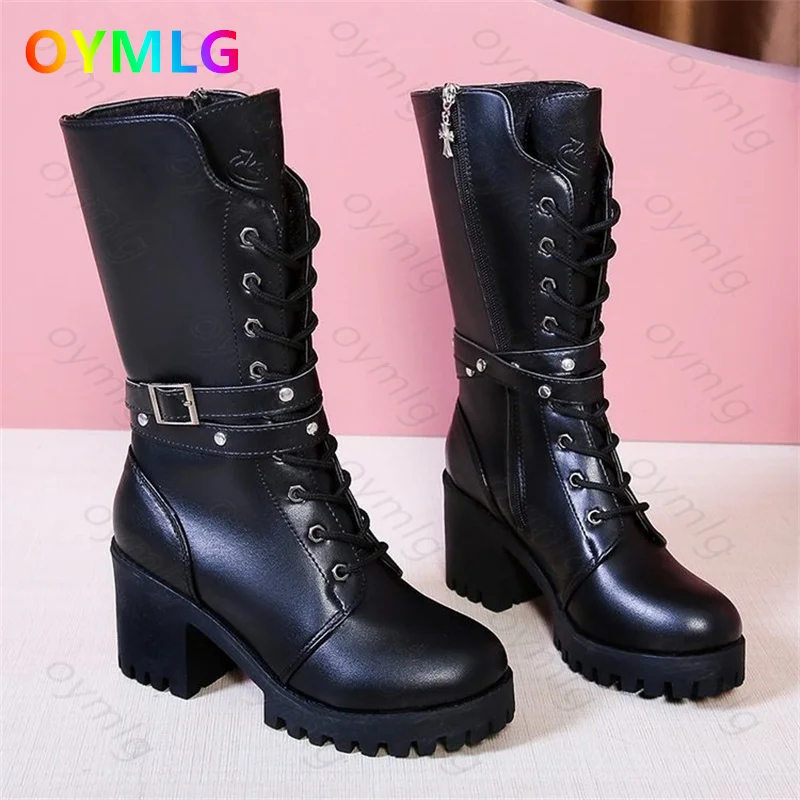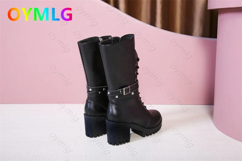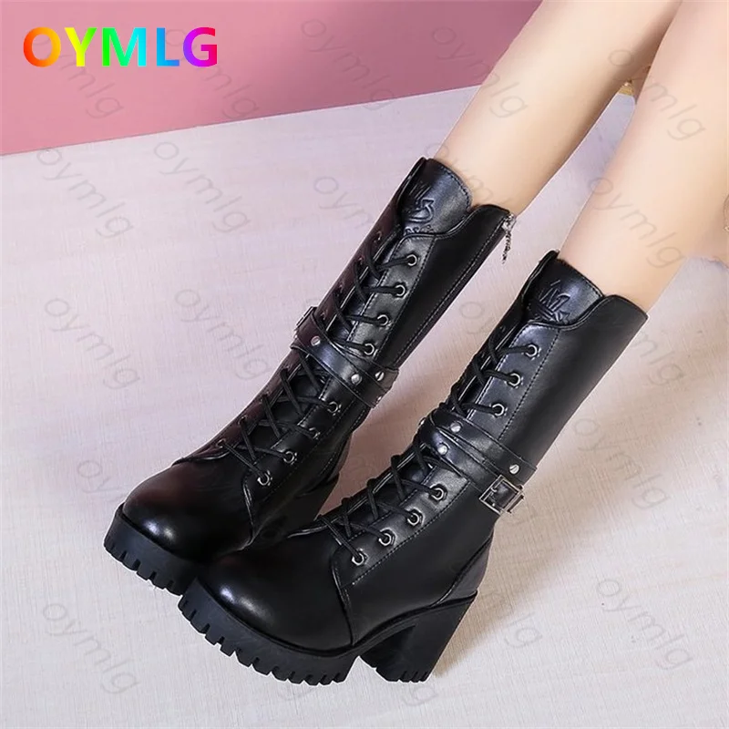 Зимние ботинки; Женская обувь из искусственной кожи на квадратном каблуке; Модные пикантные ботильоны на платформе, увеличивающие рост, со шнуровкой и круглым носком