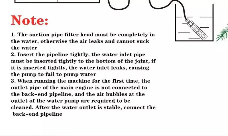 1. Всасывающая фильтрующая головка должна быть полностью погружена под поверхность воды, в противном случае протекающий воздух не сможет всасывать воду2. Вставьте трубу плотно, и впускная труба должна быть прочно вставлена в дно соединения. Если впускная труба не вставляется плотно, утечка воздуха на входе воды приведет к тому, что самовсасывающий насос не будет всасывать воду.3. Когда машина запускается в первый раз, выпускная труба главного двигателя не должна быть подключена к задней части трубопровода. После того, как пузырьки на выходе водяного насоса будут истощены, и выход воды будет стабильным, тогда задний конец трубопровода должен быть подключен.Если у вас есть другие потребности, пожалуйста, свяжитесь со службой поддержки клиентов