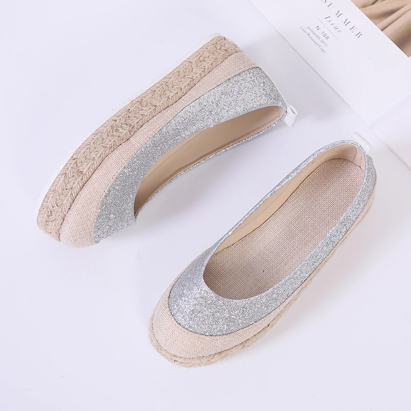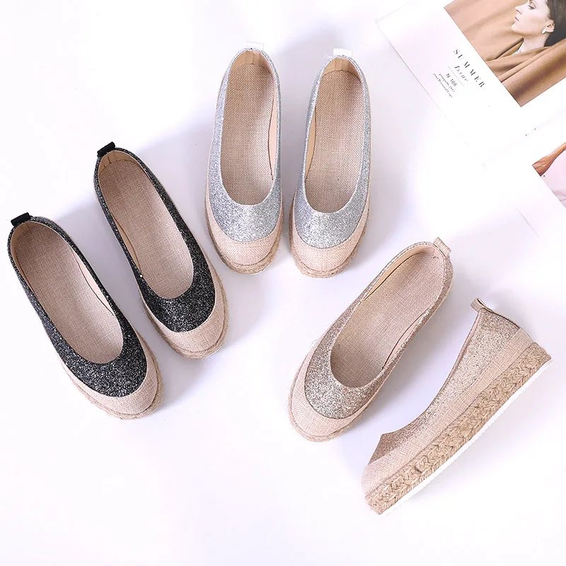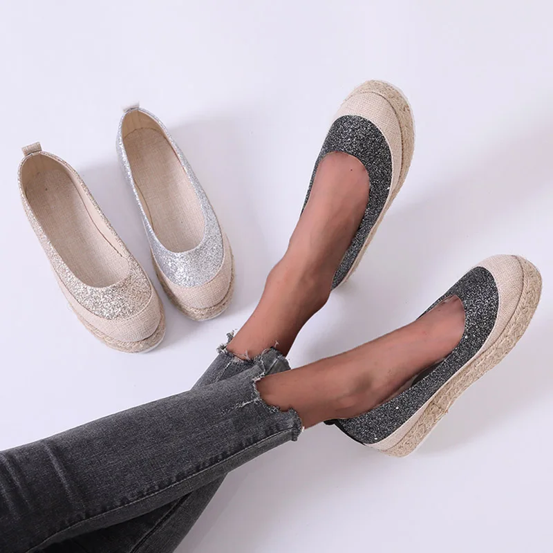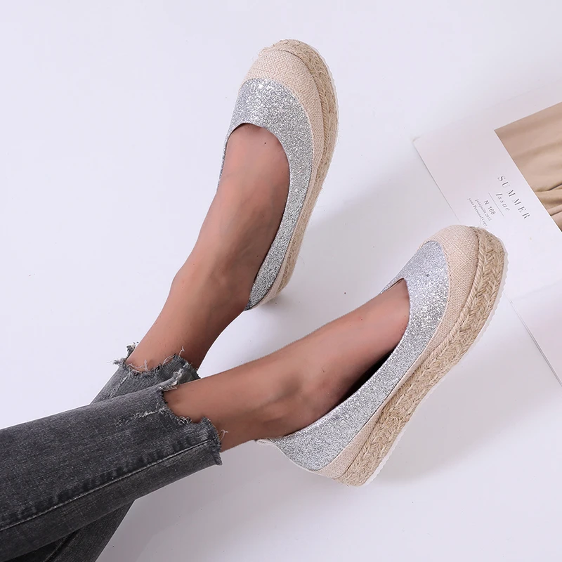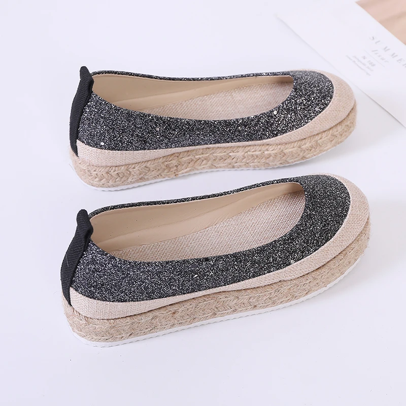 Женские эспадрильи с блестками размера плюс 43, тканевые слипоны, соломенные женские лоферы на плоской платформе, топ-сайдеры, женская обувь 9347N