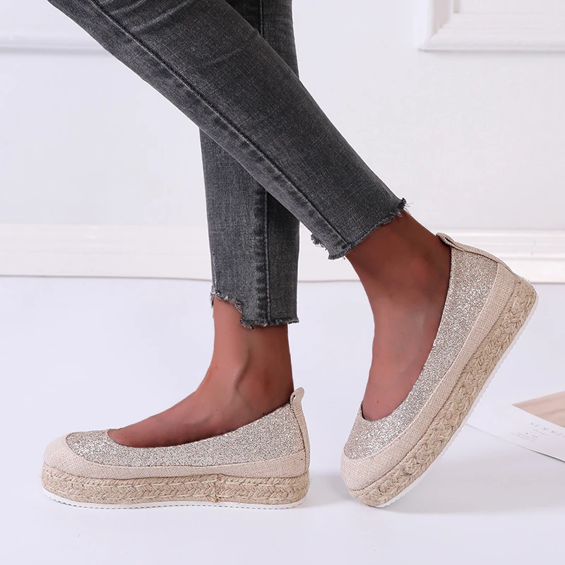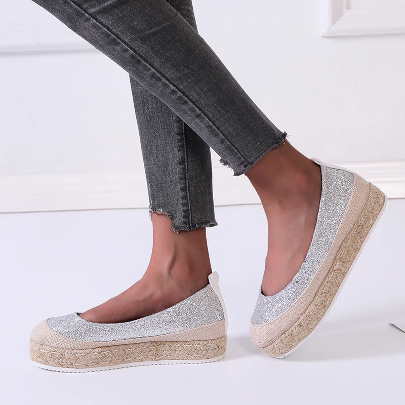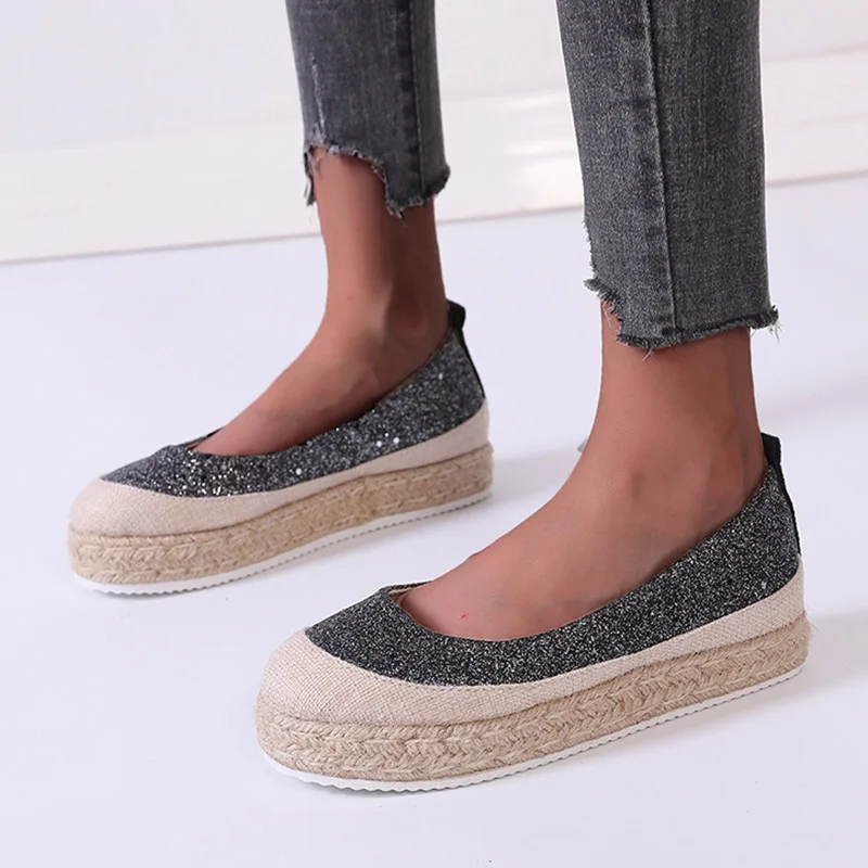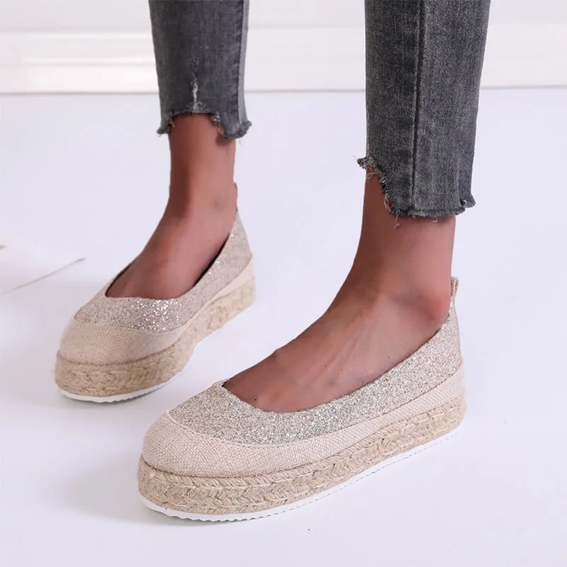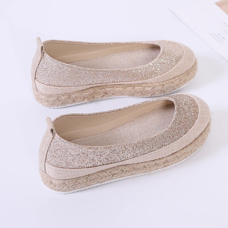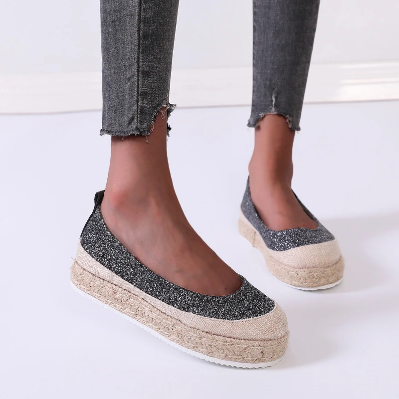 Женские эспадрильи с блестками размера плюс 43, тканевые слипоны, соломенные женские лоферы на плоской платформе, топ-сайдеры, женская обувь 9347N