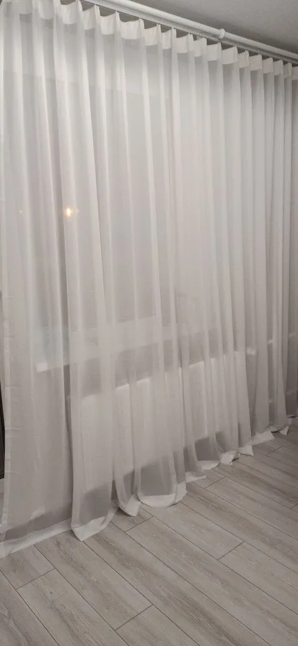 В целом товаром довольна: ткань, действительно мягкая, струящаяся, матовая, белоснежная, не сильно просвечивает. Отправлено в короткие сроки: 11 ноября заказала, 27 ноября получила. Есть недочёты в пошиве. Во-первых, ширина и длина не точно соответствуют моего заказу. Мой заказ был W300 x H245 см. Ширину на 10 см уменьшили, длину на 1,5 см. Не критично, но если продавец хочет получать стопроцентные пять звёзд, лучше не экономить на своей репутации. Есть ещё одна странность: заказывала специально на ленте (на фото видно), чтобы можно было стянуть и сделать складки, но конец ленты прочно зашили. Теперь придется расшивать кант, чтобы освободить ленту для стяжки. Кроме того есть два места, где швея не выровняла ленту и застрочила её плохо. Спасибо продавцу за набор крючков, думаю это приятный бонус. Если продавец учтёт перечисленные погрешности, можете смело у него заказывать.
