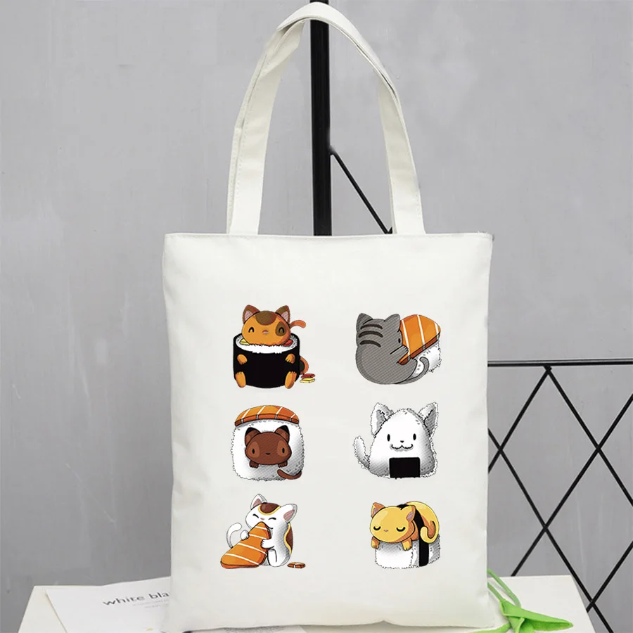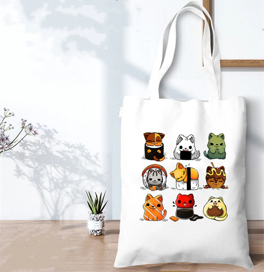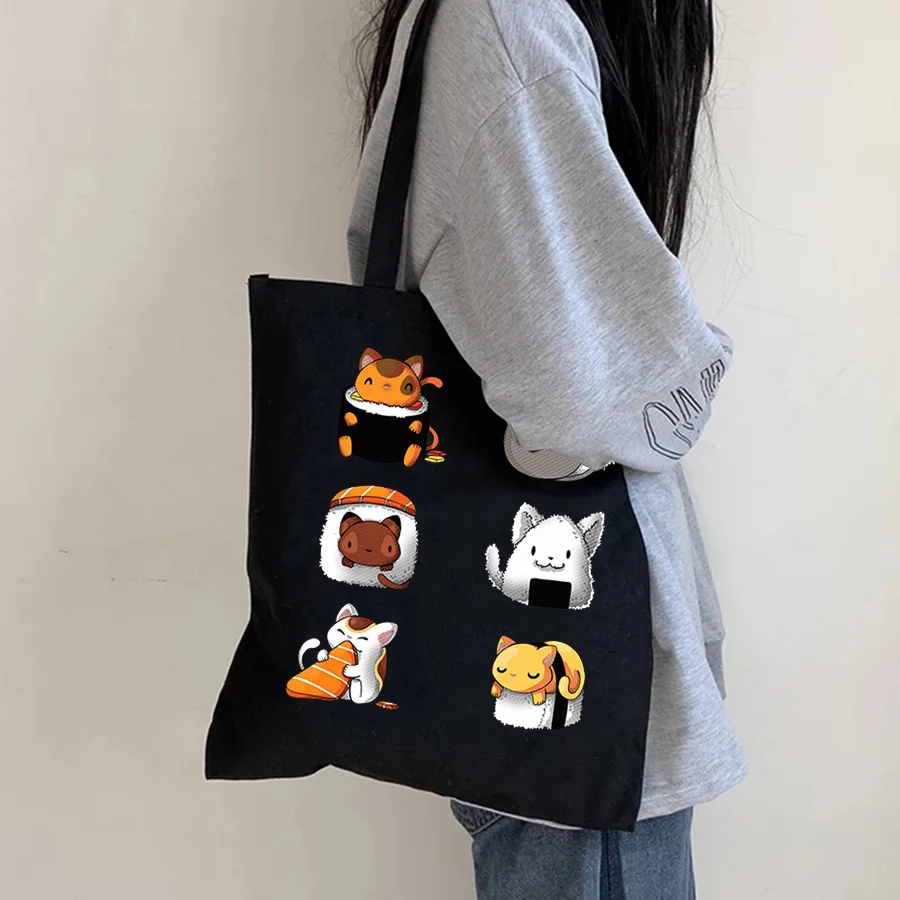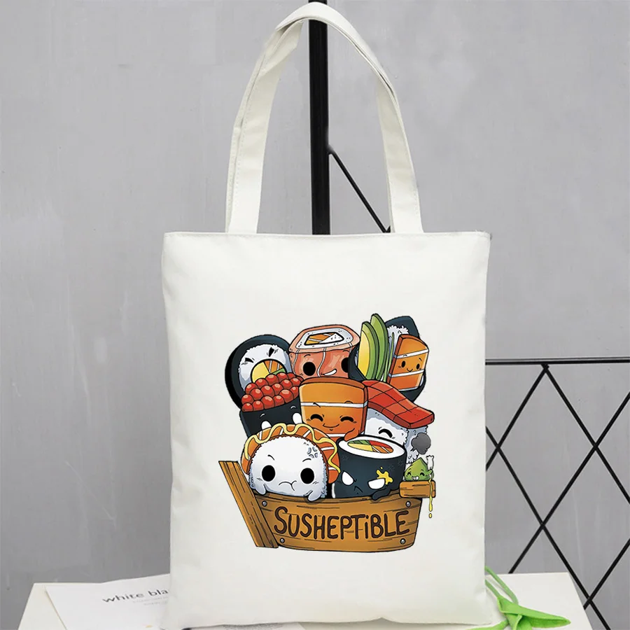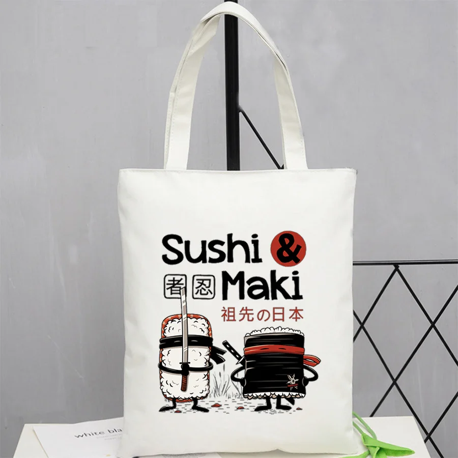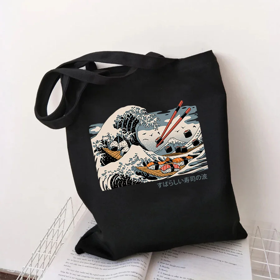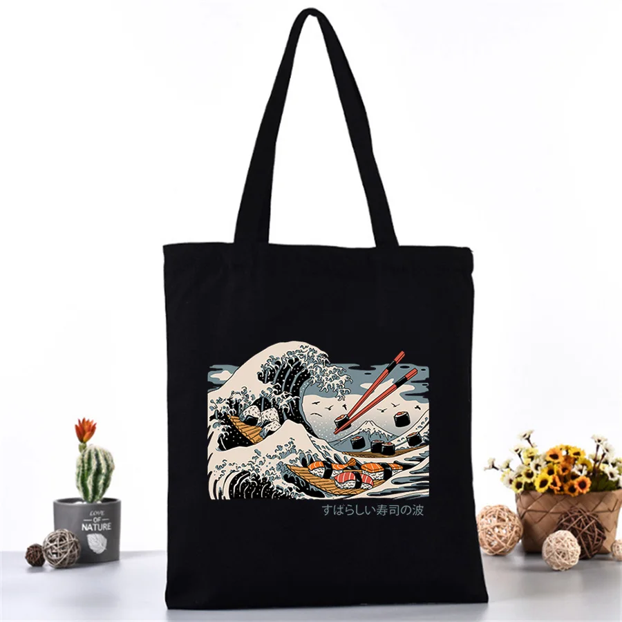 Новинка, модная женская сумка для покупок с изображением больших суши в японском стиле аниме, винтажная сумка для покупок в стиле Харадзюку, черная Холщовая Сумка через плечо, подарок учителю
