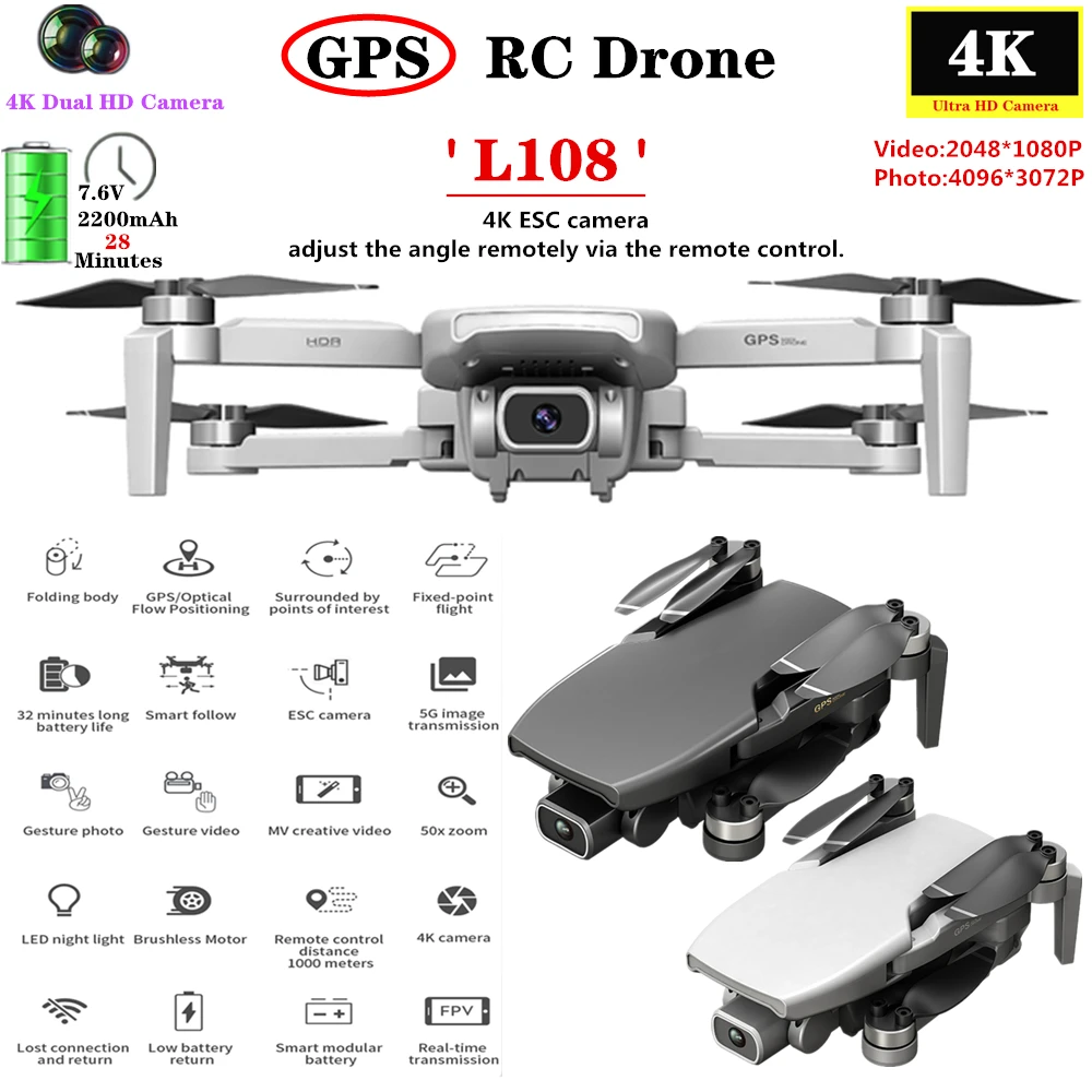 Название самолета: Дрон GPS L108 Цвет: черный, белый размер изделия (см): складной: 13*8,3*5,7; Расширение: 25*30,2*5,7 Батарея дистанционного управления: 3,7 V 350mAh литиевая батарея (входит в комплект) Перезаряжаемая батарея самолета: 7,6 V 2200mAh литиевая батарея (входит в комплект) Время полета: около 25 минут Время зарядки: около 4,5 часов Расстояние дистанционного управления: около 1000 метров Расстояние передачи изображения Wi-Fi: 600 м (свободное взаимодействие и отсутствие окклюзии) Мотор: 1503 бесщеточный мотор Гироскоп: 6 осей Частота кадров: 25 кадров в секунду Скорость передачи: 5G WIFI Конфигурация частота: 2,4 ГГц Ручная съемка жестов/видеозапись: 1-3 м Режим записи фотографий: пульт дистанционного управления или управление приложением 4K HD камера: регулируемая камера передатчиком, 90 ° Фото пикселей: 4096*3072P Разрешение видео: 2048*1080P