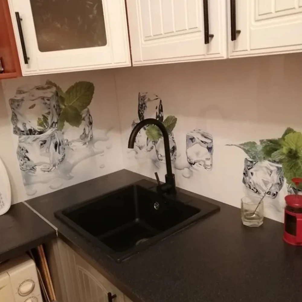 Фартук для кухни АБС пластик с фотопечатью Лед и мята идеально подходит для индукционных и электрических плит (выдерживает температуру нагрева до +80 градусов). Для газовых плит рекомендуем использовать прозрачное защитное стекло у варочной поверхности. Его также можно купить у нас!