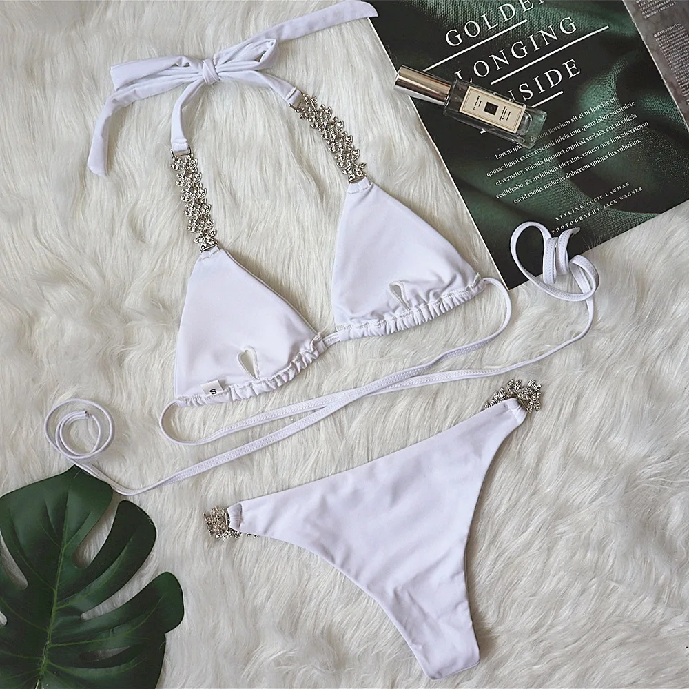 Бикини со стразами, новинка 2021, сексуальный купальник, женский купальник, Женский бандажный комплект бикини с лямкой на шее, купальный костюм, летняя пляжная одежда для плавания