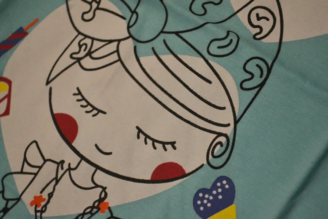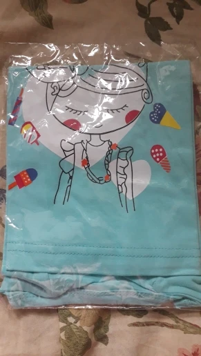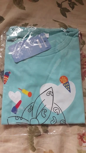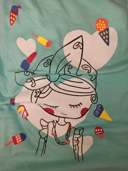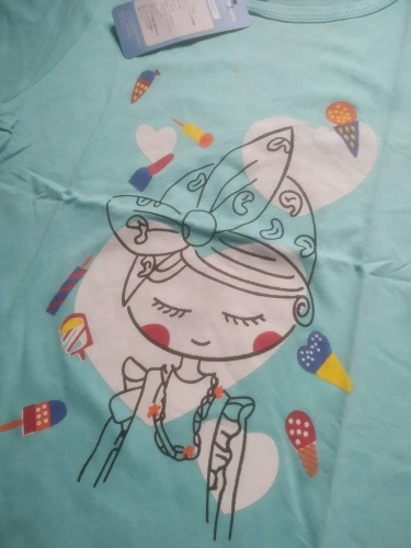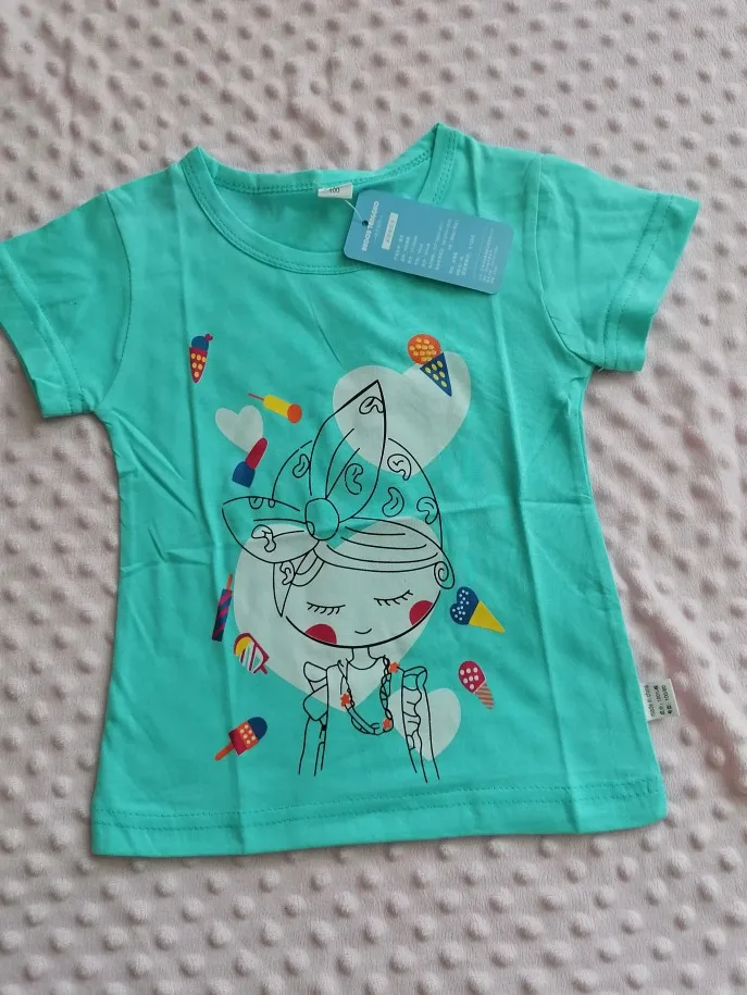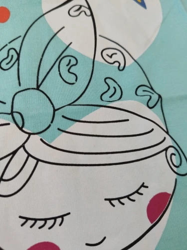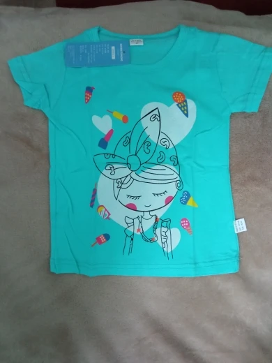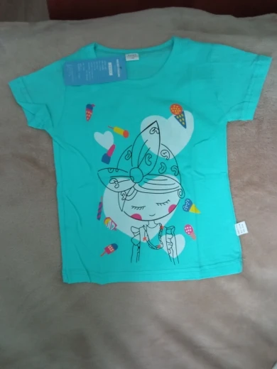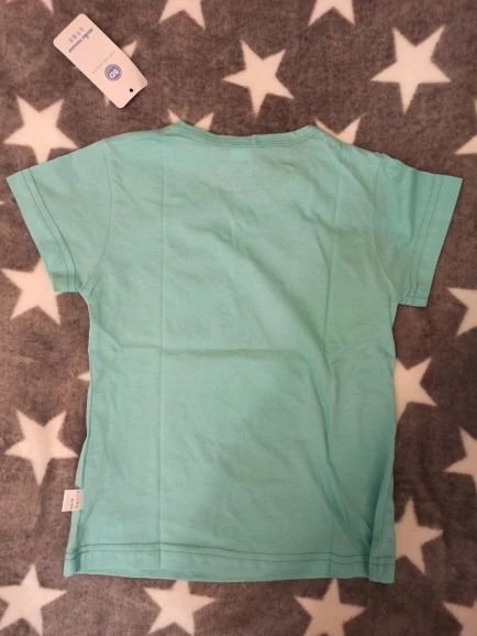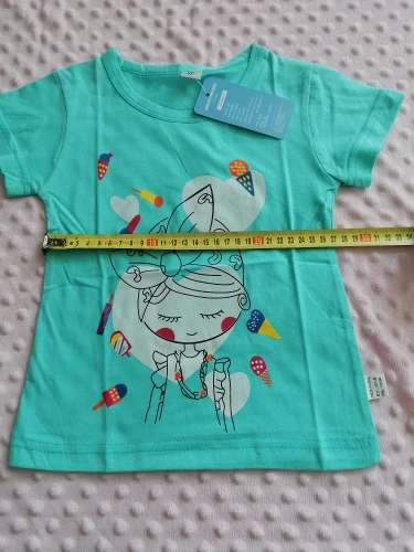 Śliczna bluzeczka, materiał to na pewno bawełna. Nadruk jest w porządku, kolor w rzeczywistości to rączej błękitny niż miętowy. Bez nieprzyjemnego zapachu, przyszła zapakowana w folię. Rozmiar to takie 100-110, córka nosi teraz 98 i jest trochę za duża
