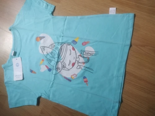 футболка крутая, плотная, ошиблась размером, вместо 110 взяла 140 , смотрится как мини платье. довольна как слон