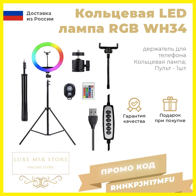 Кольцевая светодиодная лампа с пультом RGB LED wh34 предназначена для настройки правильного света при проведении фотосессий (для фото лица - макияж, прическа и т.д.) Кольцевая лампа с держателем для телефона отлично подойдет для селфи. Применяется для фотографии, потокового видео и прямой трансляции. Подходит для мобильных телефонов до 6,5 дюймов. Вращение на 360 градусов для регулировки угла. Основные характеристики: - Диаметр 34 см - Цветовая температура: 3000К-6000К - Напряжение: 5 В (пауэрбанк, ноутбук, зарядник для мобильных) - Цвет: холодный цвет / теплый цвет / натуральный цвет + RGB свет - Регулируемые цвета: регулируемая яркость и смешение цветов, специальные цветовые эффекты - Регулируемая яркость: 10-100% (10 уровней) - Количество ламп LED - 120 шт - НЕТ ультрафиолетового и инфракрасного излучения, низкая тепловая мощность, безопасность и защита окружающей среды. Штатив для этой лампы: артикул 19148064