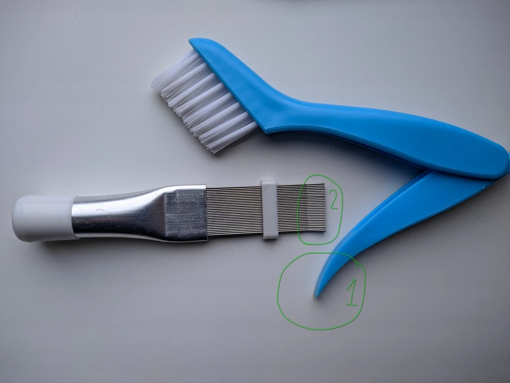 Хорошие щётки из жесткой лески и короткой ручкой - удобно чистить радиаторы. Сначала используйте синий пластиковый нож для выравнивания сильно загнутых пластин. (№1 на фото) Потом стальную щётку - для полного выравнивания пластин. (№2 на фото) Конечный результат на фото 3. Со стальной щеткой осторожнее - может порвать тонкие пластины.