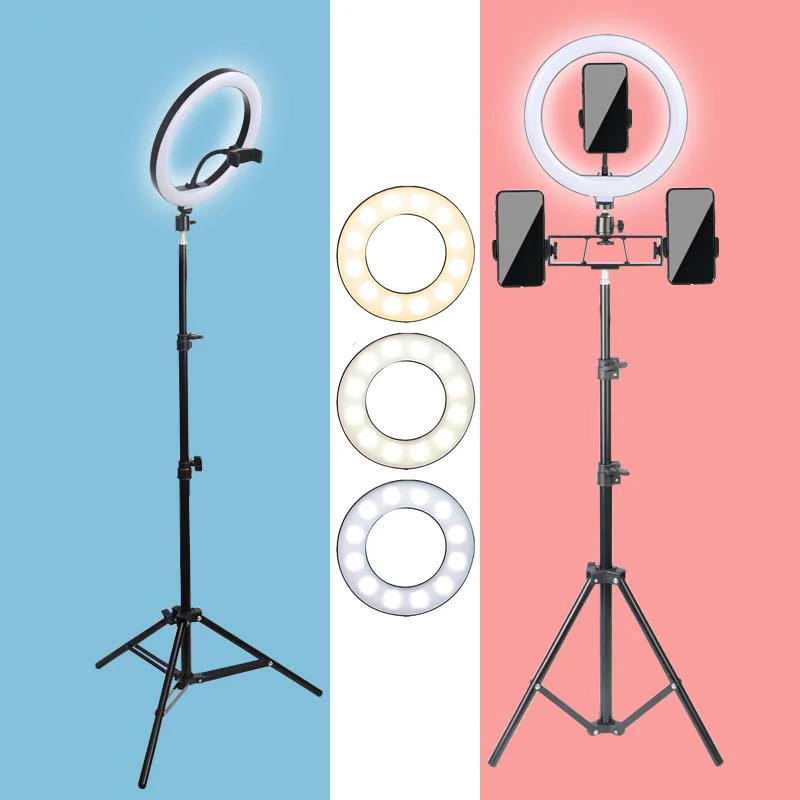 Кольцевой светильник для макияжа, LED ламсветильник с регулируемой яркостью, со штативом, держателем для телефона, фото-и видеокамеры, YouTube