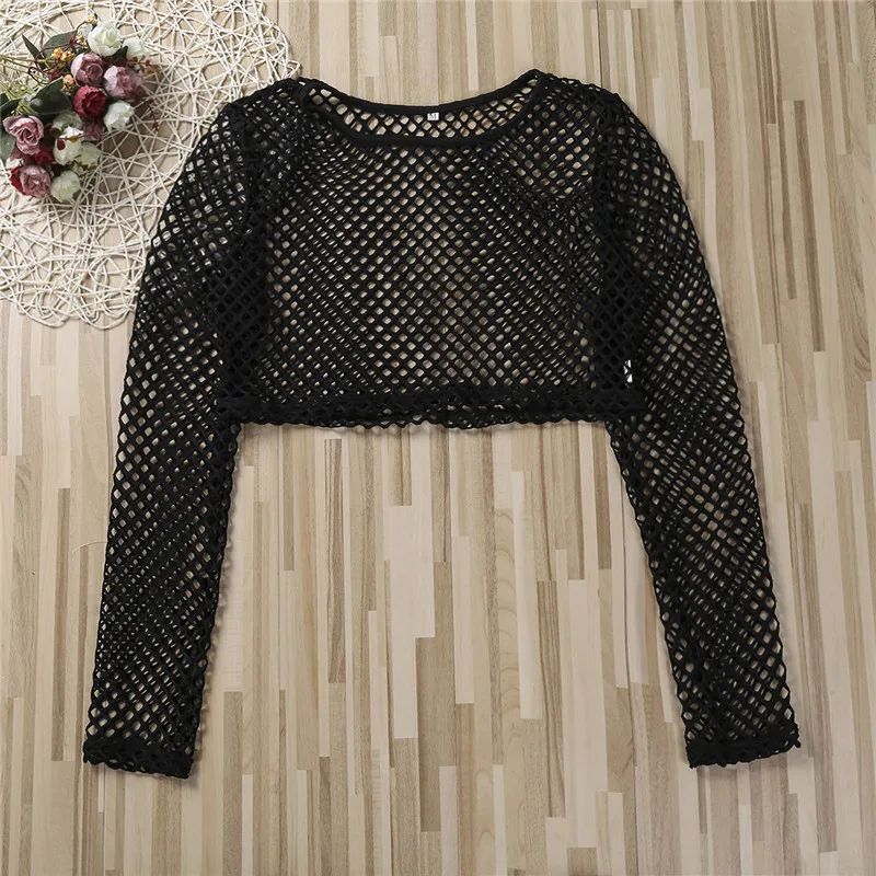 Женский свободный сетчатый прозрачный Повседневный короткий топ с полным рукавом