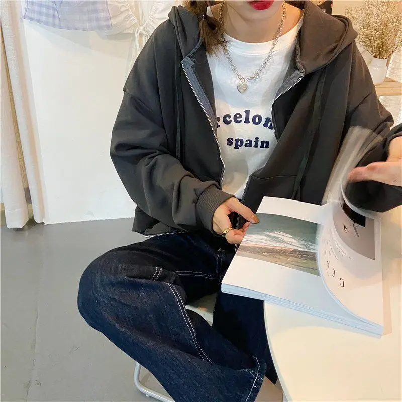 Свитшот на молнии в стиле Харадзюку, осень 2021, женские толстовки в Корейском стиле, свободная рубашка с длинным рукавом и надписью для влюбленных, однотонная