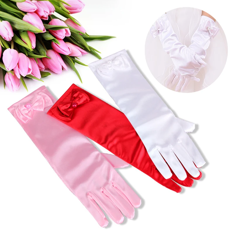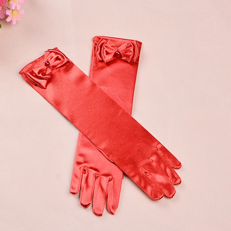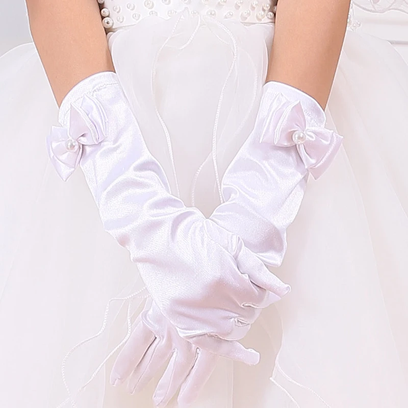 Длинные эластичные атласные перчатки для девочек, милвечерние детские праздничные перчатки для девочек с белым жемчугом и бантом на палец для выступлений, аксессуары