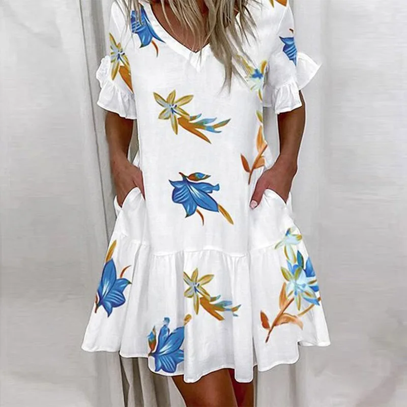 Женское мини-платье с цветочным принтом, V-образным вырезом и коротким рукавом