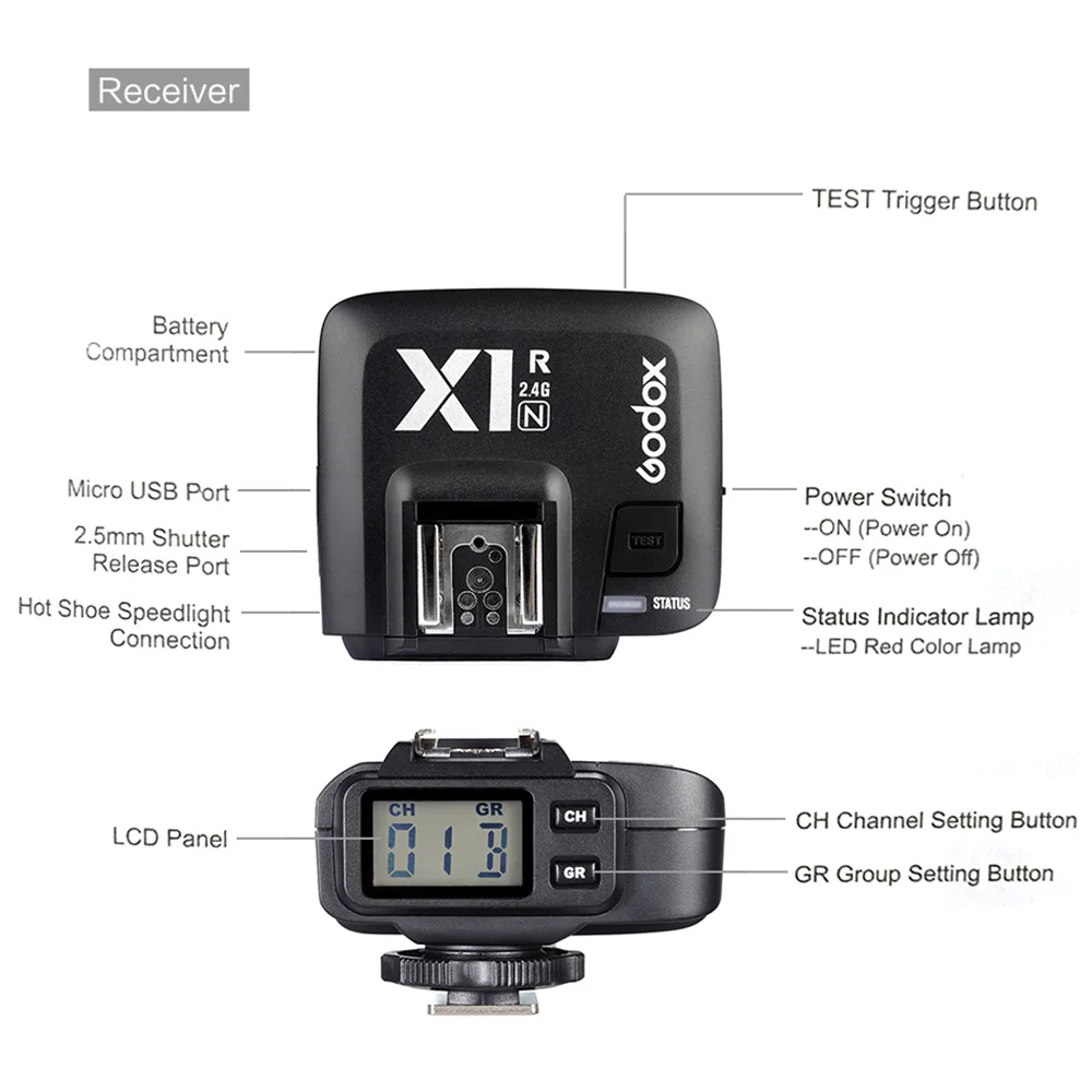 Примечание:1/8000s достигается, когда камера имеет максимальную скорость затвора камеры 1/8000s.Характеристики:Бренд: GodoxМодель: X1R-NТип: для NikonСовместимость с: для цифровых зеркальных камер Nikon (i-TTL autoflash); Поддержка всех камер с разъемом для синхронизации ПКВстроенная система дистанционного управления: Беспроводная передача 2,4GМетод модуляции: MSKИсточник питания: 2 * батарейки типа АА (не входят в комплект)-Контроль экспозиции:Ручная Вспышка: ДаАвтоматическая Вспышка TTL: i-TTL-TTL контроль:Высокая скорость синхронизации: ДаКомпенсация экспозиции вспышки: Да, ± 3 остановки 1/3 остановки увеличенияБлокировка вспышки: ДаФокусировка: ручная работаМульти Вспышка: Да (AD360II/TT685N как приемник)Синхронизация второго занавеса: Да (настройка на камере)Моделирующая вспышка: Да, работает с кнопкой предварительного просмотра глубины камеры-Беспроводная вспышка:Функция Wireles: совместимость с Nikon CLS (создание системы освещения)Управляемая подчиненная Группа: макс. 6 групп (M/A/B/C/D/E)Дальность передачи (прибл.): >100 метровКанал: 32 канала-- Другие:Набор задержки синхронизации: Да (0-10 мс, используйте 100US в качестве блока)Настройка зума: Фокусное расстояние можно регулировать через передатчикПанель дисплея: широкая ЖК-панель, Подсветка ВКЛ/ВЫКЛВыходной интерфейс: приемник: Используйте 2,5 мм кабель синхронизации для выводаФункция памяти: настройки будут храниться через 2 секунды после последней операции и восстановиться после перезапускаПриемник Размеры/Вес: 7*6,5*4,7 см/68,5 гПосылка Размеры: 11*5,5*11 см/4,3*2,2 * 4.3inПосылка Вес: 192g/6,8 oz