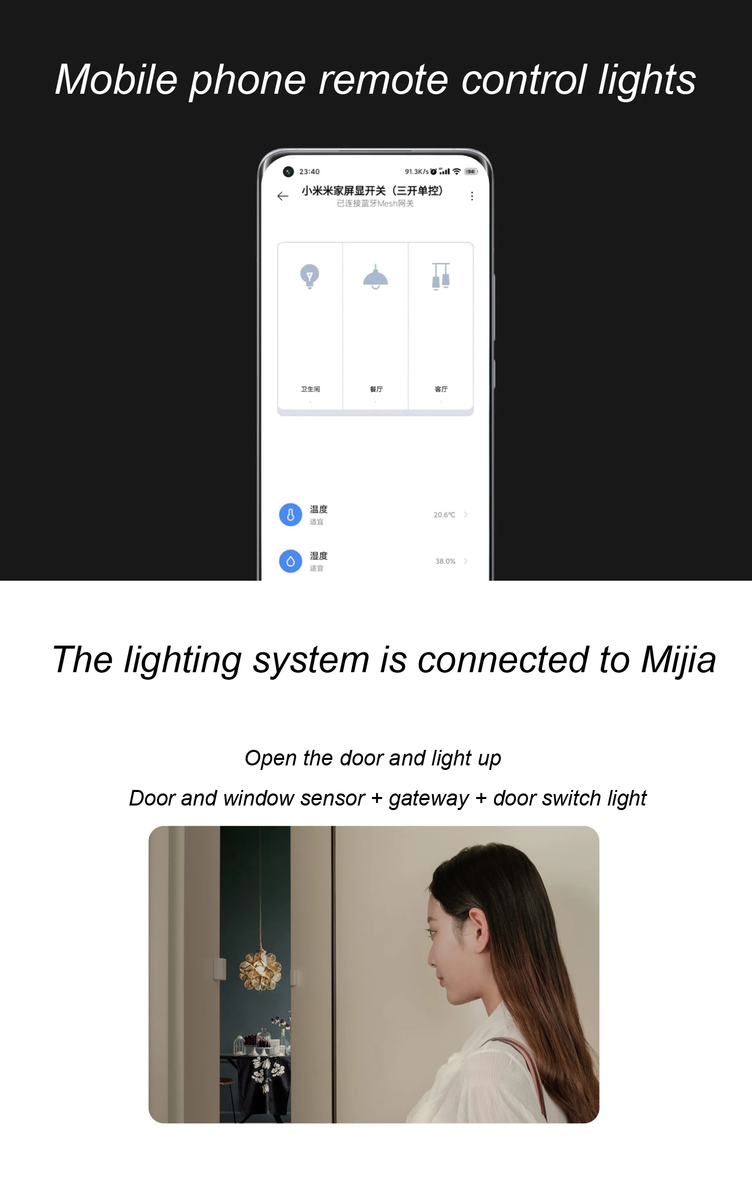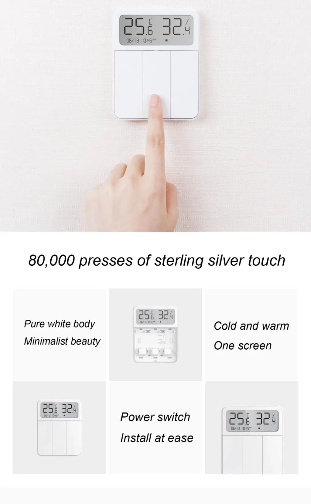 ▪Встроенный датчик температуры и влажностиХолодная и теплая, сухая и влажная, легко захватываетсяВстроенный датчик температуры и влажности, через экран, вы можете четко видеть температуру и влажность комнаты, где находится выключатель, и подключиться к кондиционеру и увлажнителю в комнате связи Mijia.▪Чистый большой экран, теплый и холодный, сухой и влажныйВремя и погода, увидеть все на одном экранеВы можете проверить температуру и влажность, дату и время, а также погоду на открытом воздухе в помещении, где переключатель расположен через экран на выключателе. Нет необходимости заменять Аккумулятор для термометра и гигрометра, и информация о температуре и влажности может быть загружена удобно и быстро.▪Мобильный телефон с дистанционным управлениемВключите и выключите светильник, лежа в кроватиСлишком ленив, чтобы выйти из кровати? Забыли выключить светильник, когда вы выходили? Измените его и проверьте работу переключателя управления статусом в любое время через приложение Mijia.▪Система освещения подключена к MijiaСделайте свет дома «smart»После замены выключателя, система освещения вашего дома также стала частью умного дома, связывая умные устройства дома.▪Выключатель-светильникЭто также универсальный переключатель для умных устройствПосле доступа к приложению Mijia, вы можете настроить любой ключ как переключатель других умных устройств в вашем доме.▪Подключение к сетевому шлюзу BluetoothИнтеллектуальная жизнь более продвинутаяЭкранный переключатель Xiaomi Mijia может использоваться для просмотра состояния устройства через мобильный телефон, а также может быть подключен к продуктам со встроенной функцией Bluetooth Mesh gateway, возможность удаленного просмотра статуса, получения уведомлений переключателя и связи с другими интеллектуальными продуктами.▪80000 прессов контактов из стерлингового серебраБезопасный и прочный, высокое качество изготовленияТочная механическая конструкция, более длительное использование. Латунное основание + Стерлинговое Серебро контактная конструкция, лучшая проводимость, не легко окисляется, прочный и безопасный.