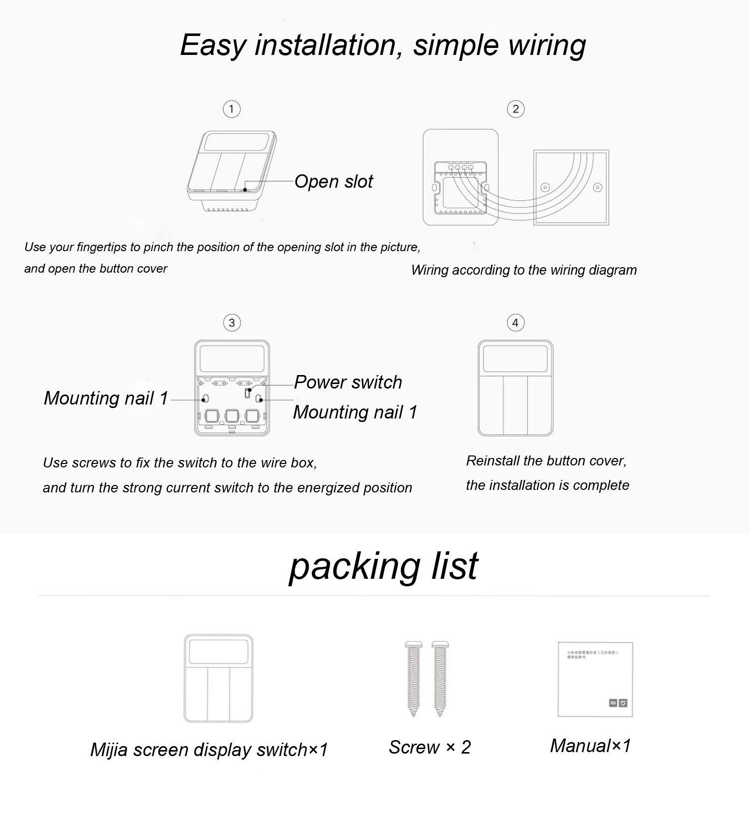 1 x Экран Xiaomi Mijia переключатель дисплея (три биллинга управления)2 винта1 х Руководство