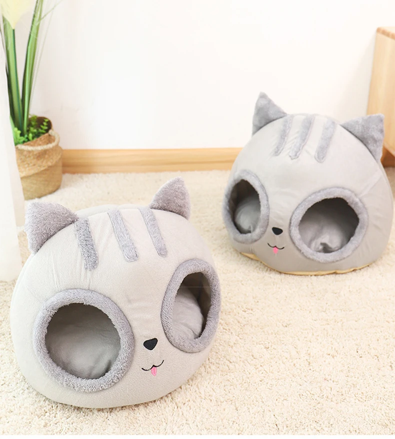 Плюшевая кровать для кошек, глубокий спальный домик в стиле головы кошки, мягкая теплая корзина для кошек и собак с ковриком, аксессуары для домашних животных