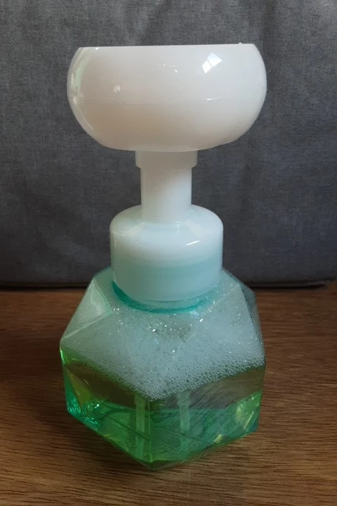Так же, как на фото. Я купил 300 мл, я заполнил его 1/3 жидким мылом и до верхней части с водой, затем я хорошо смешал его, чтобы смешать воду с мылом, и цветок выглядит хорошо. Это идеальная доза для мытья рук. Это пришло быстро, как через 2 недели.